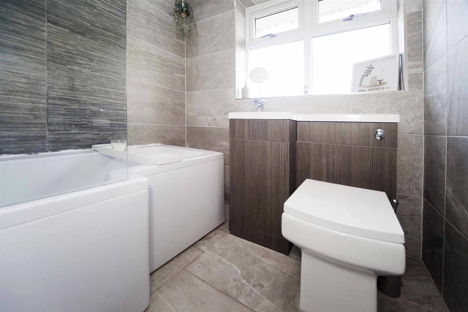 The stylish bathroom comprises 'P' shaped bath, over bath shower and glass shower screen, concealed cistern WC and vanity wash basin, beautiful tiling.