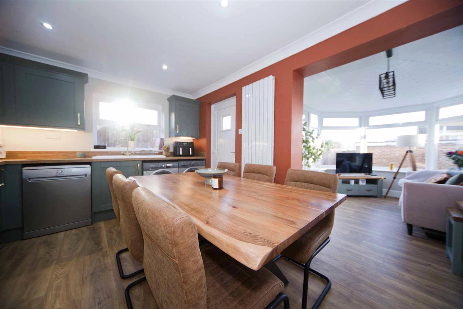 Fabulous newly fitted open concept kitchen diner fitted with a selection of shaker style wall, base and drawer cabinetry, wine rack, complimentary wood block surfaces, integrated oven, integrated gas hob, integrated stainless multifunction extractor, plumbing for washing machine, plumbing for dishwasher, space for tumble dryer, space for fridge freezer, sink with mixer tap, storage cupboard, recessed spotlights, laminate flooring, decorative coving, tasteful decor, column radiator, half glazed exterior door and ample dining space into;