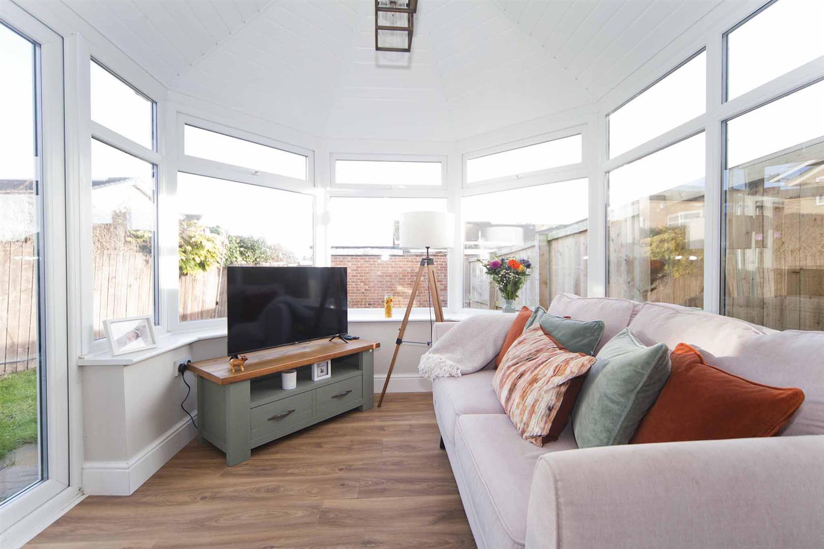 Conservatory with French doors leading to the rear garden, laminate flooring, lovely decor.