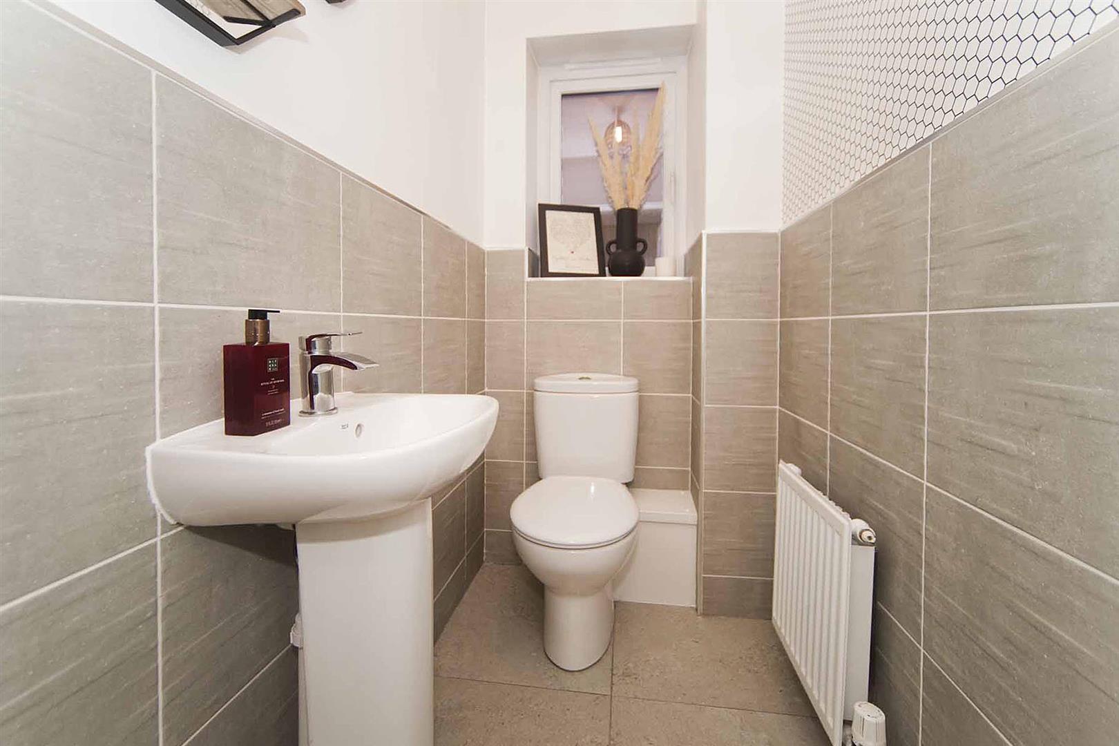 Guest cloakroom comprising close coupled WC and pedestal wash basin, half tiled walls.