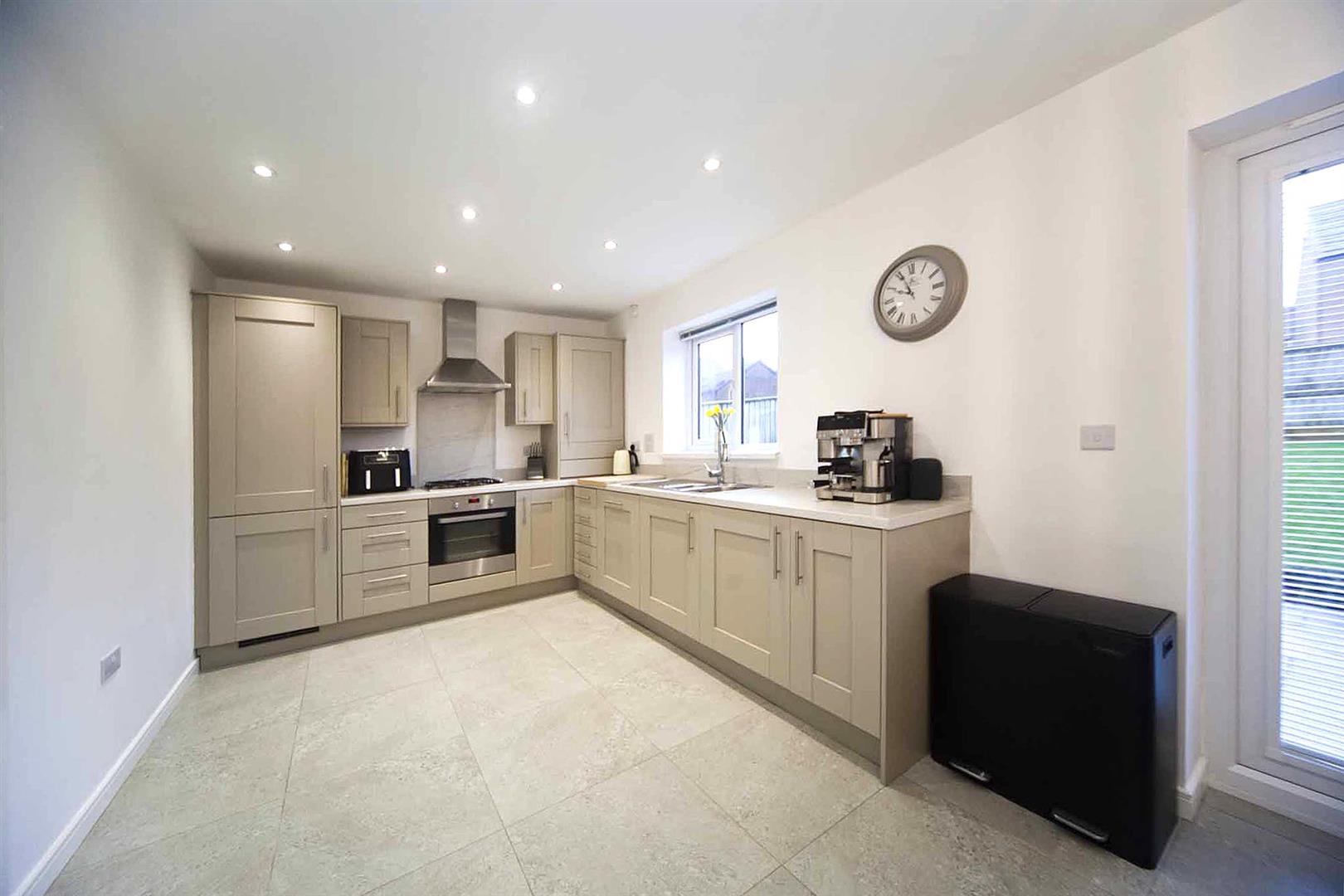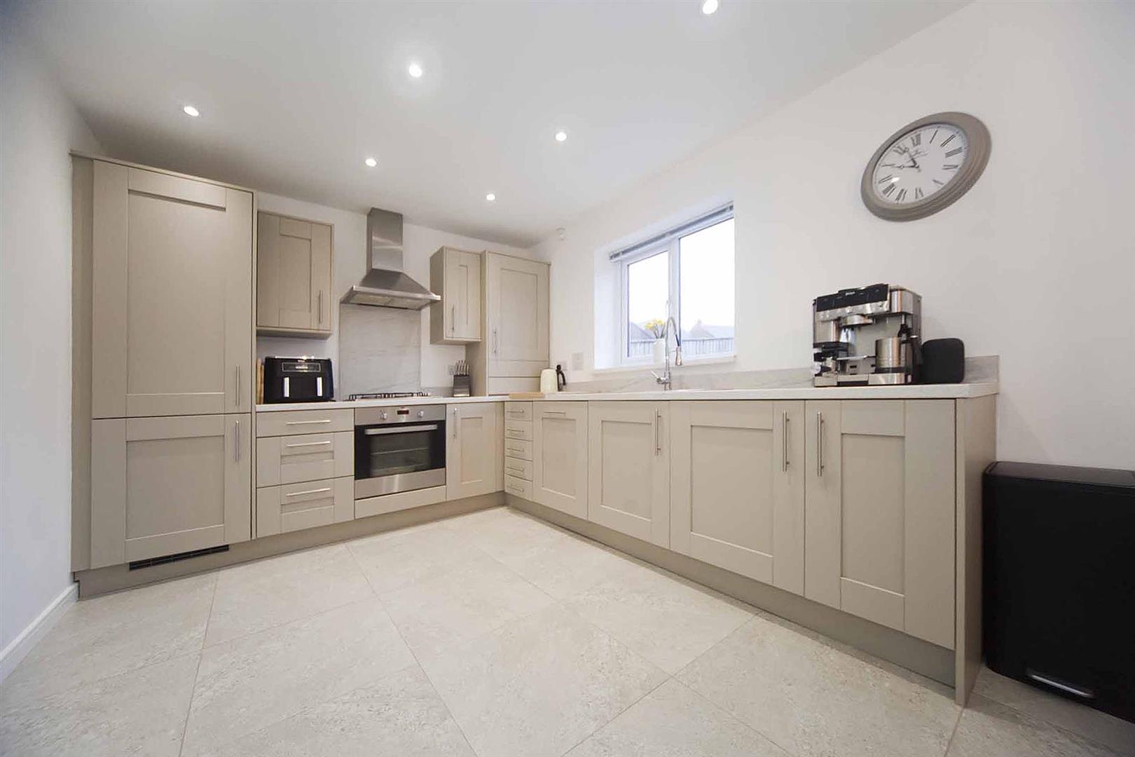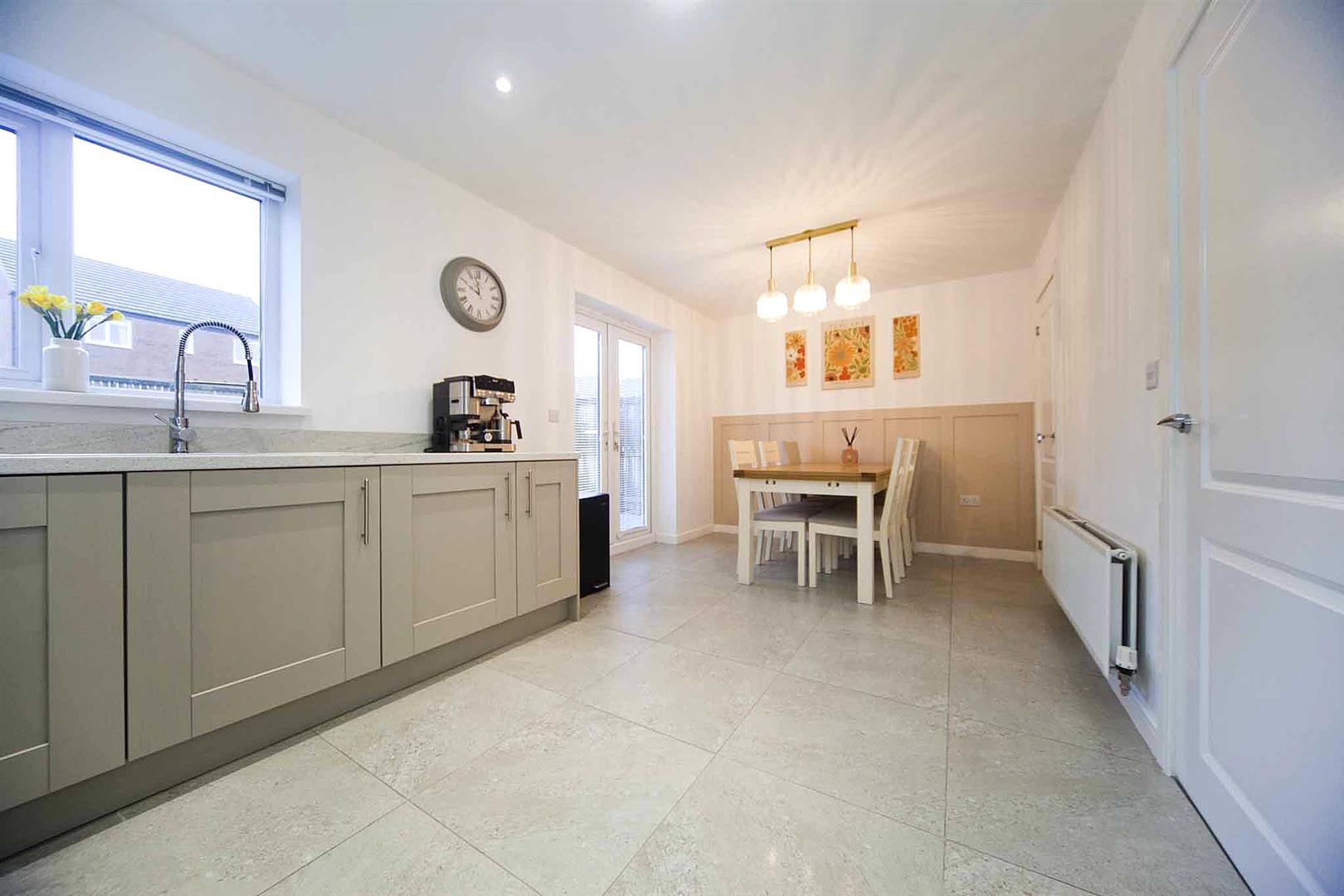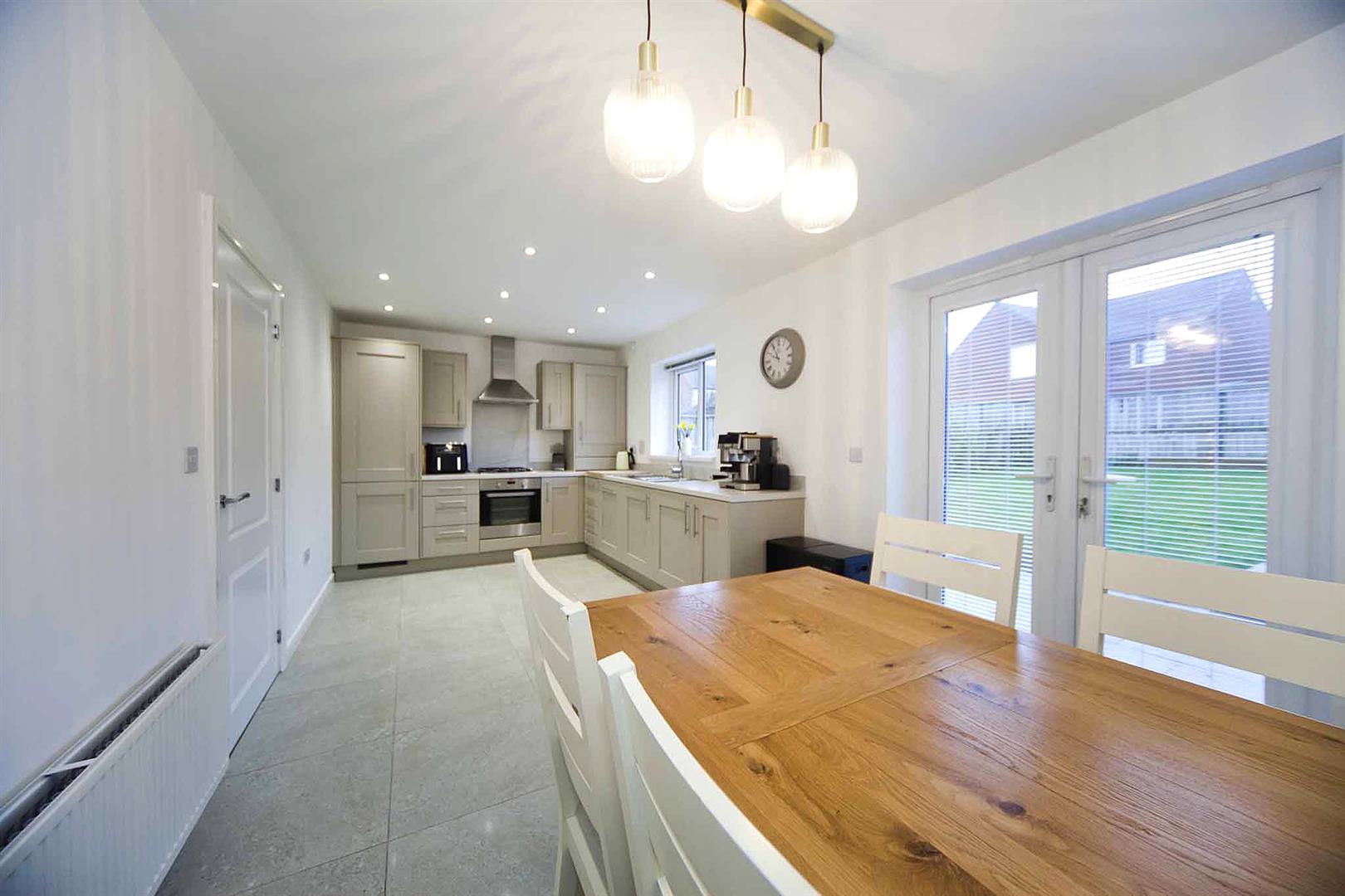 Rear aspect open plan kitchen diner fitted with an array of shaker style larder, wall, base and drawer cabinets, complimentary surfaces, integrated oven, integrated gas hob, integrated stainless extractor, integrated washing machine, integrated fridge freezer, integrated dishwasher, sink with mixer tap, recessed spotlights, tiled floor, ample space to dine, feature bespoke half panelled wall, fitted storage cupboard, French doors opening to the rear garden.