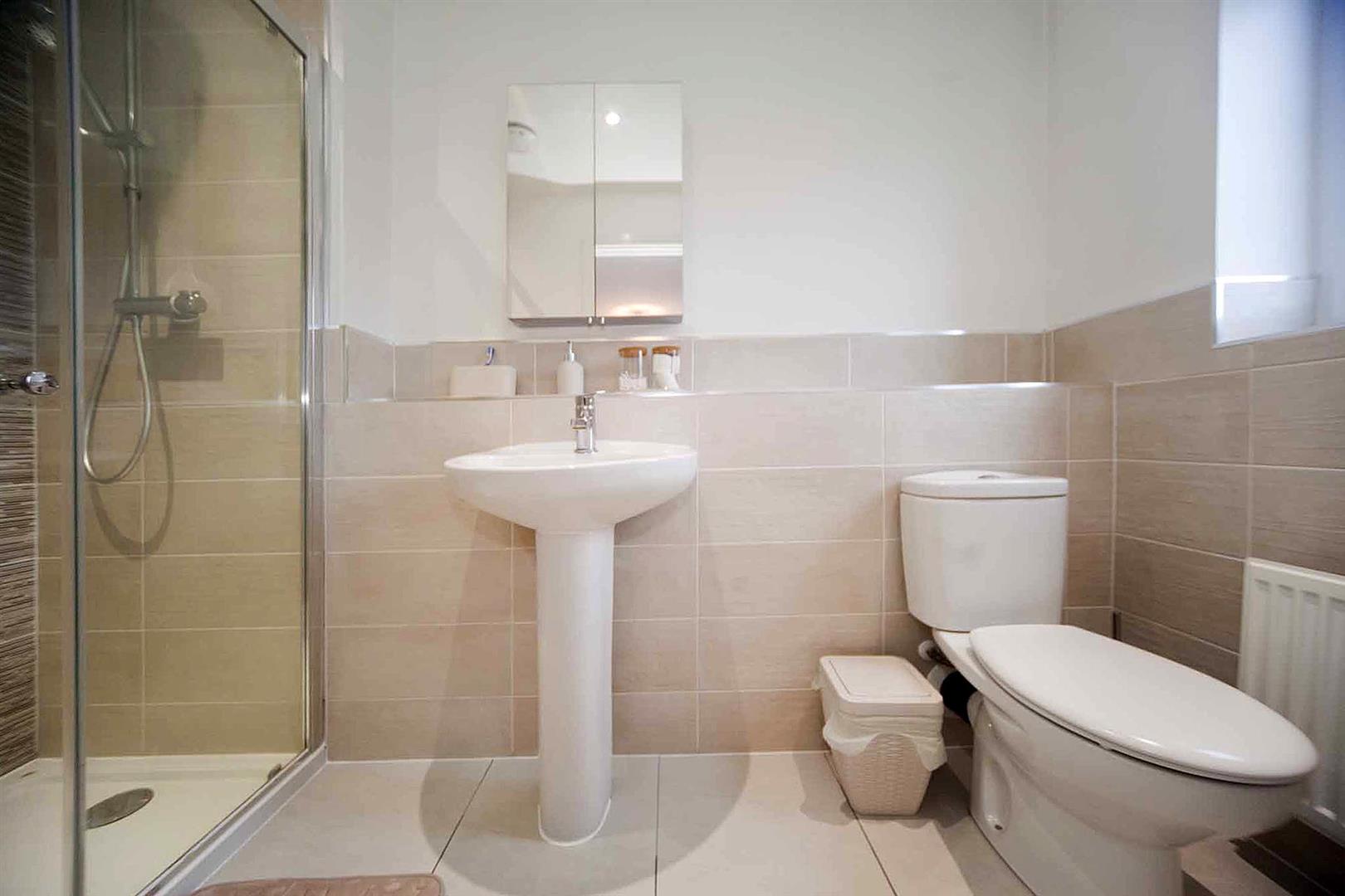 En suite shower room comprising oversized shower enclosure, close coupled WC and pedestal wash basin, superb tiling.
