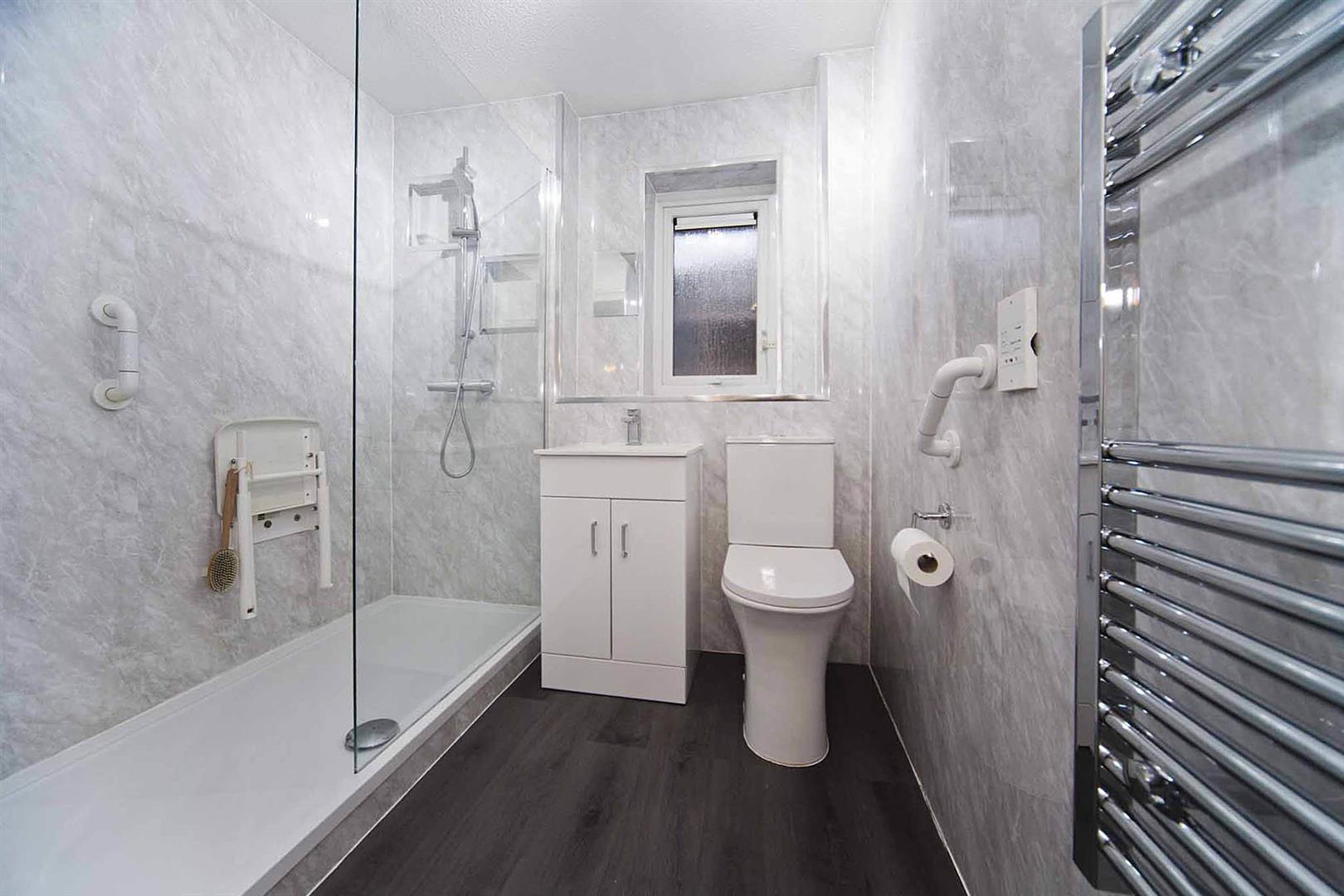 The recently fitted, modern shower room comprises oversized shower enclosure, close coupled WC and vanity wash basin, chrome heated towel radiator, complimentary wall panelling.