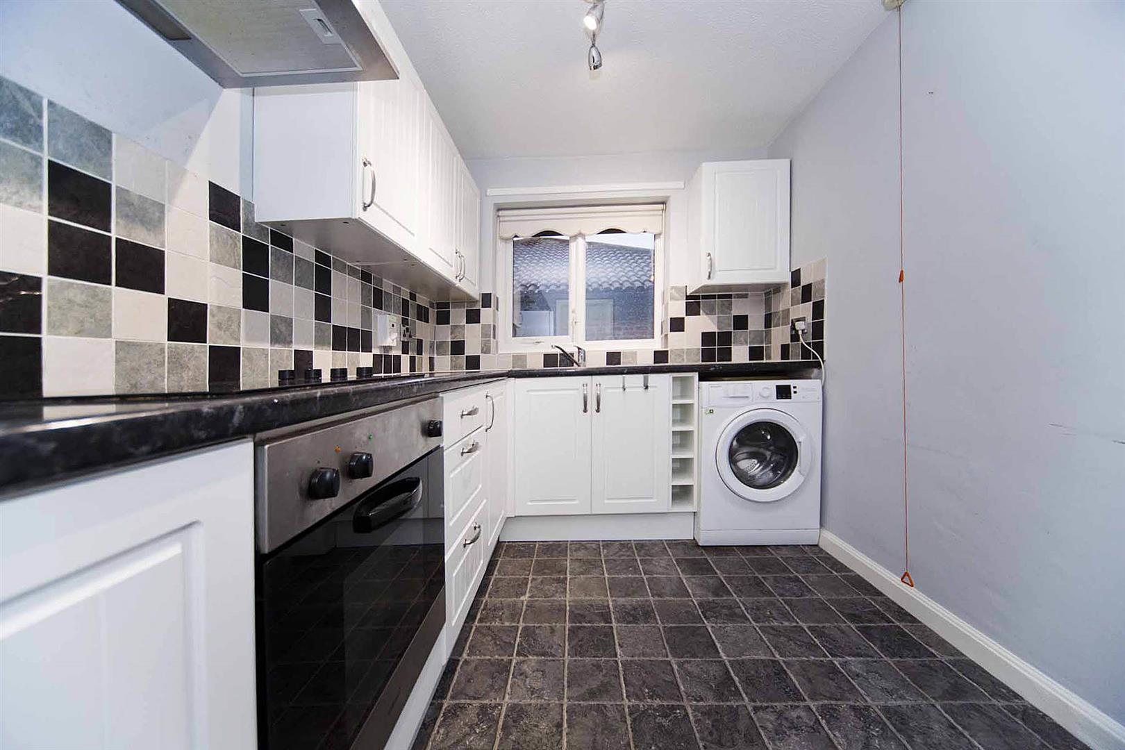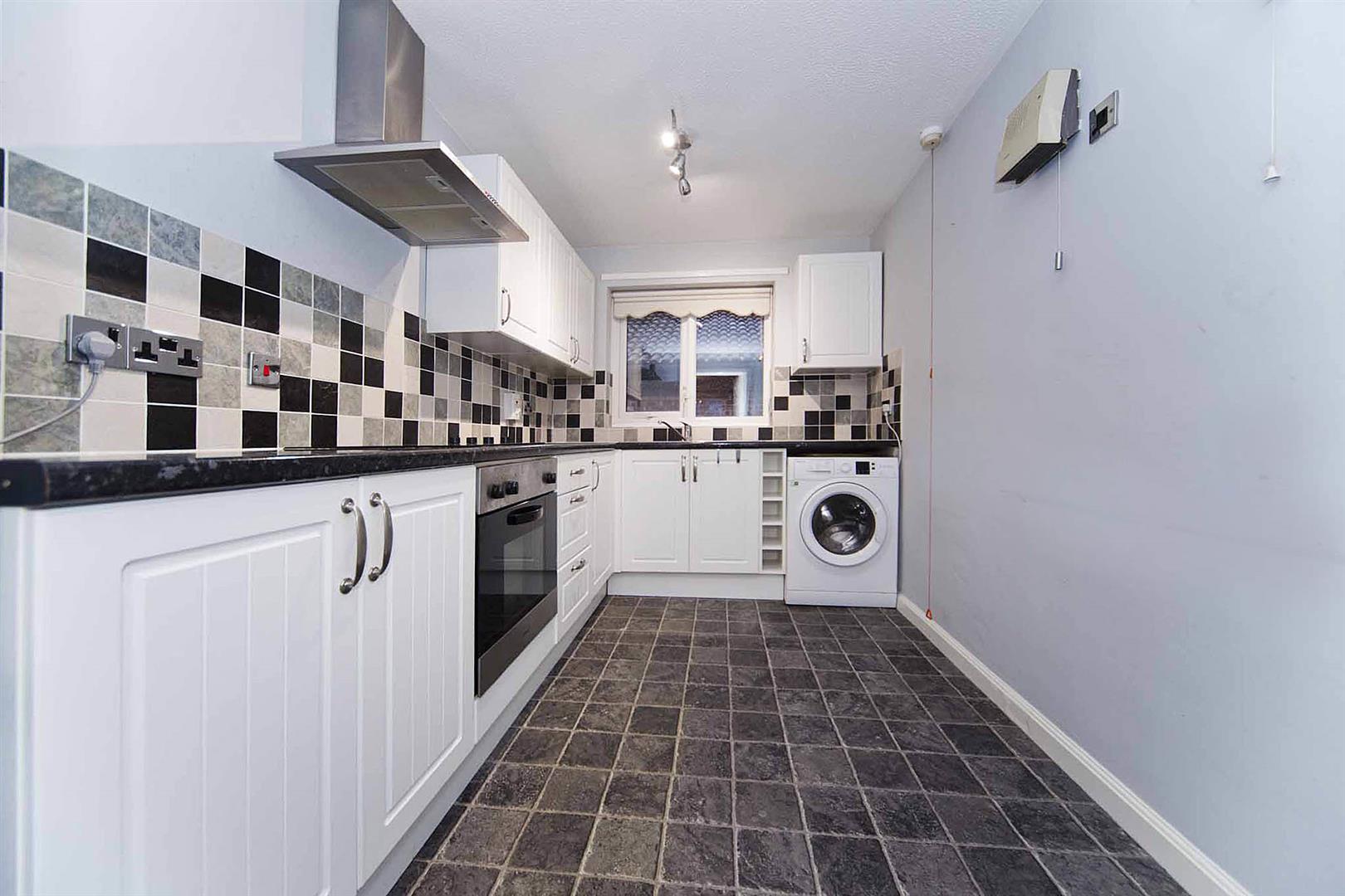 The well equipped kitchen features a range of wall, base, and drawer cabinetry, complimentary surfaces, tiled backsplash, integrated oven, integrated ceramic hob, integrated stainless extractor, space for fridge freezer, plumbing for washing machine, sink with chrome mixer tap, space for breakfasting table.