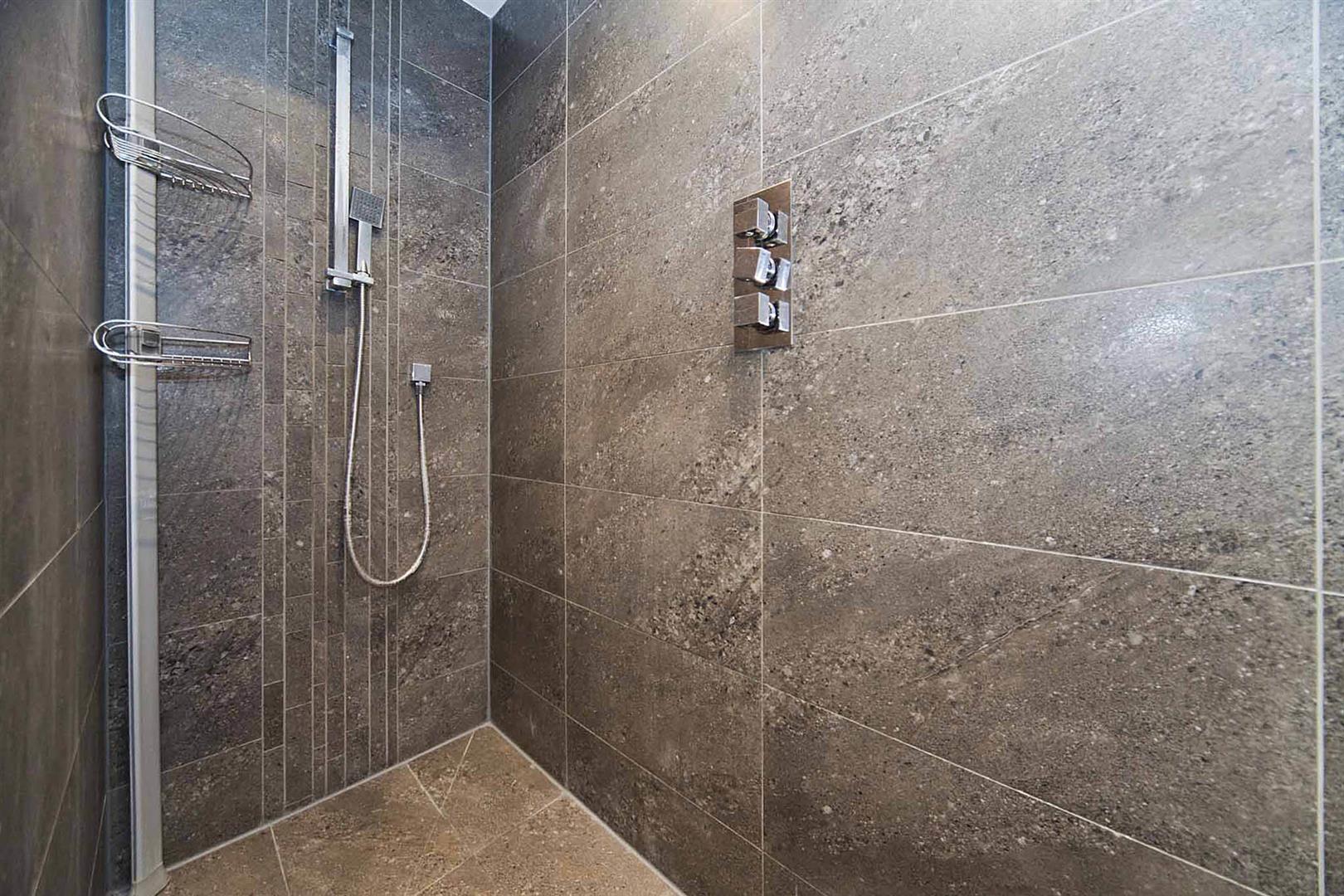 En suite shower/wet room comprising open shower, concealed cistern WC and vanity wash basin, fully tiled to walls and floor, recessed spotlights, chrome heated towel radiator, under floor heating.