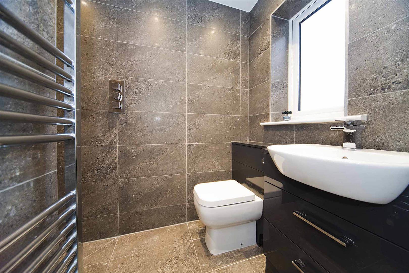 The pristine, recently fitted family bathroom comprises bath, concealed cistern WC and vanity wash basin, half tiled walls, chrome heated towel radiator.