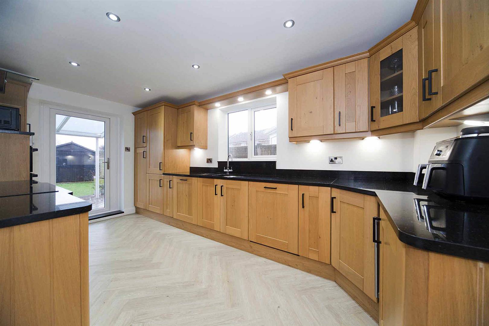 Good size kitchen fitted with a plethora of larder, display, wall, base and drawer cabinets, complimentary granite surfaces, integrated double oven, integrated ceramic hob, integrated stainless multifunction extractor hood, integrated fridge freezer, integrated dishwasher, integrated washing machine, integrated wine cooler, inset one and a half bowl sink with chrome mixer tap, recessed spotlights and cabinet lighting, column radiator, pristine decor, modern flooring, rear aspect exterior door.