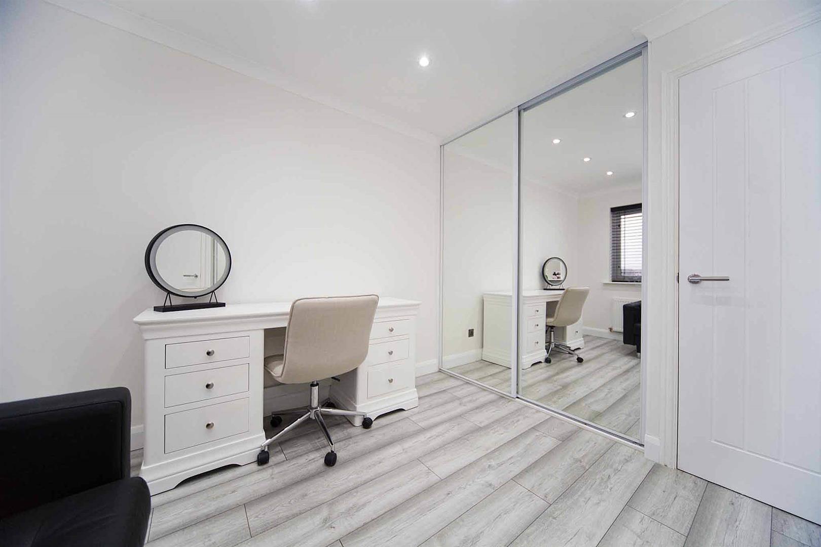 Bedroom two is another double room with front elevation window and fitted sliding mirrored wardrobes, recessed spotlights, immaculate decor, decorative coving.