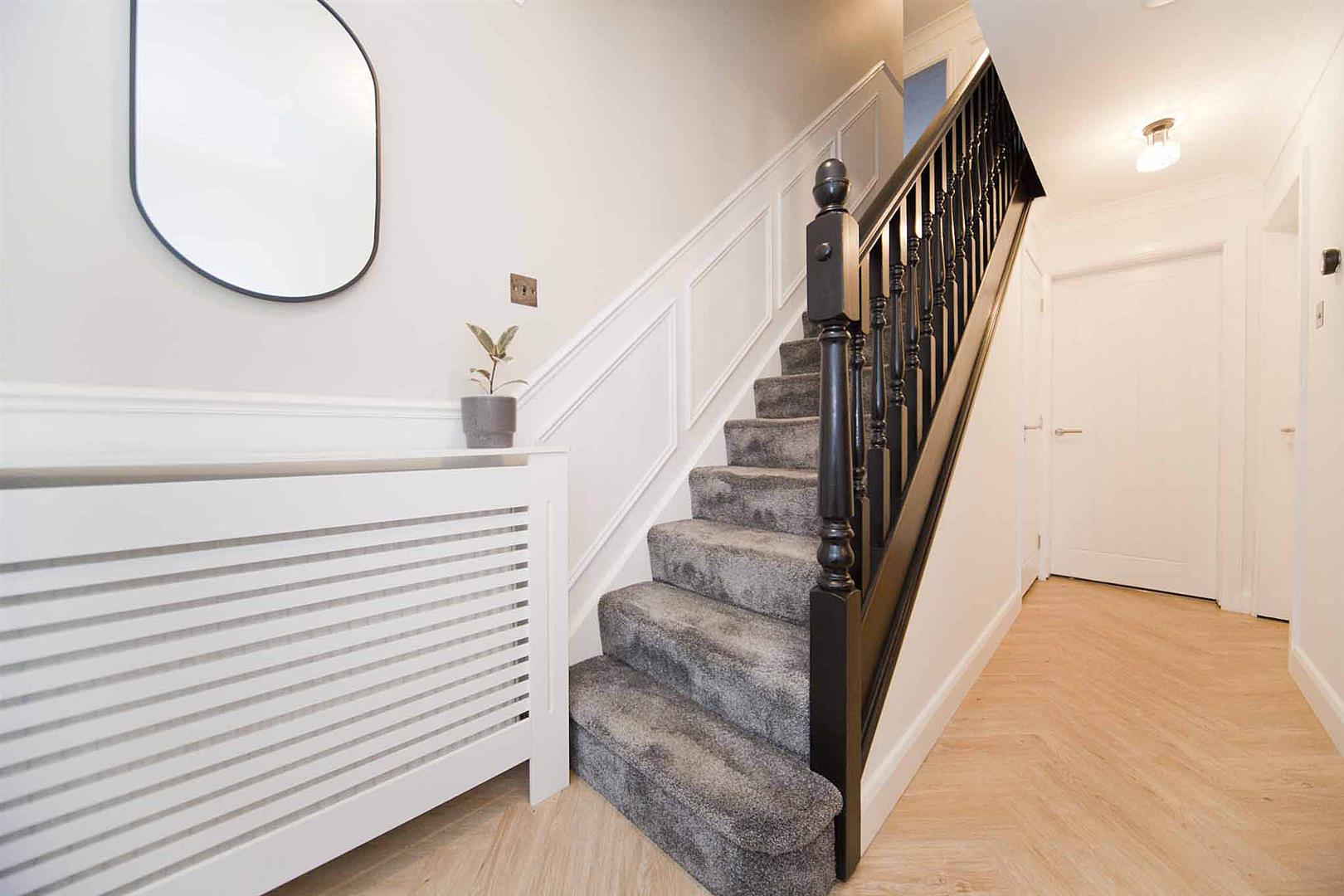 Entrance hall with stairs to the first floor accommodation, beautiful herringbone flooring, custom wall panelling, pristine decor.