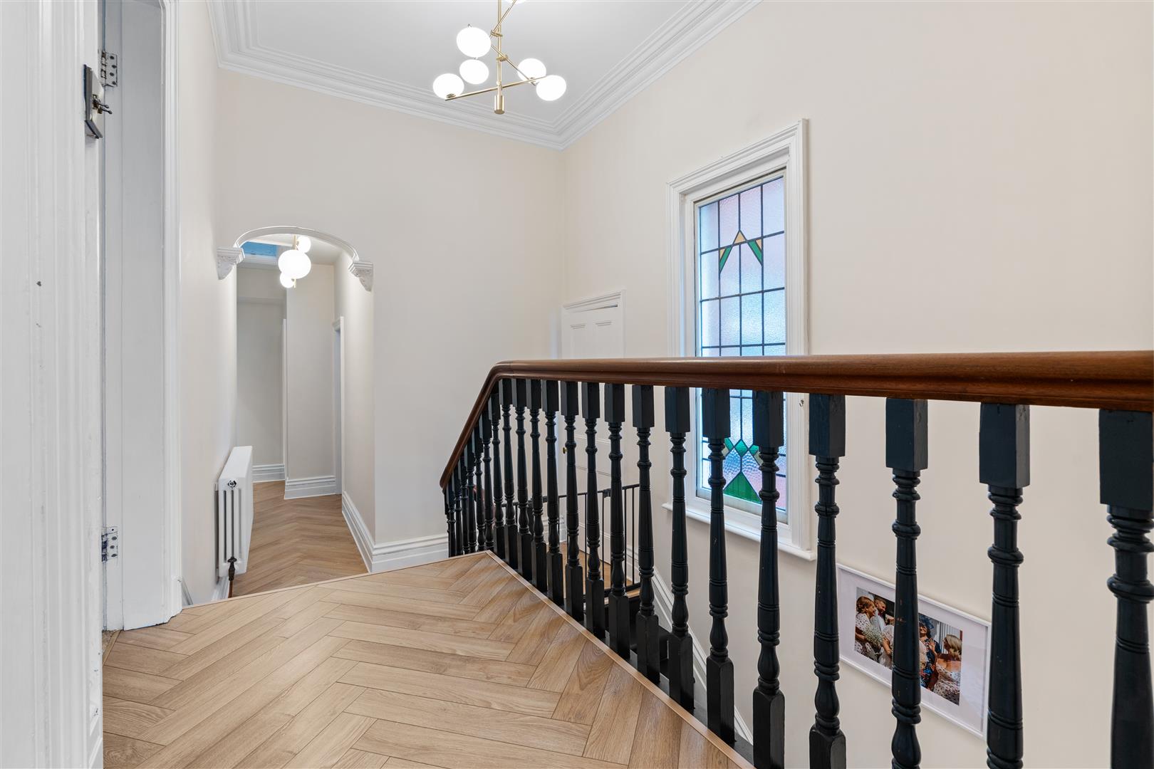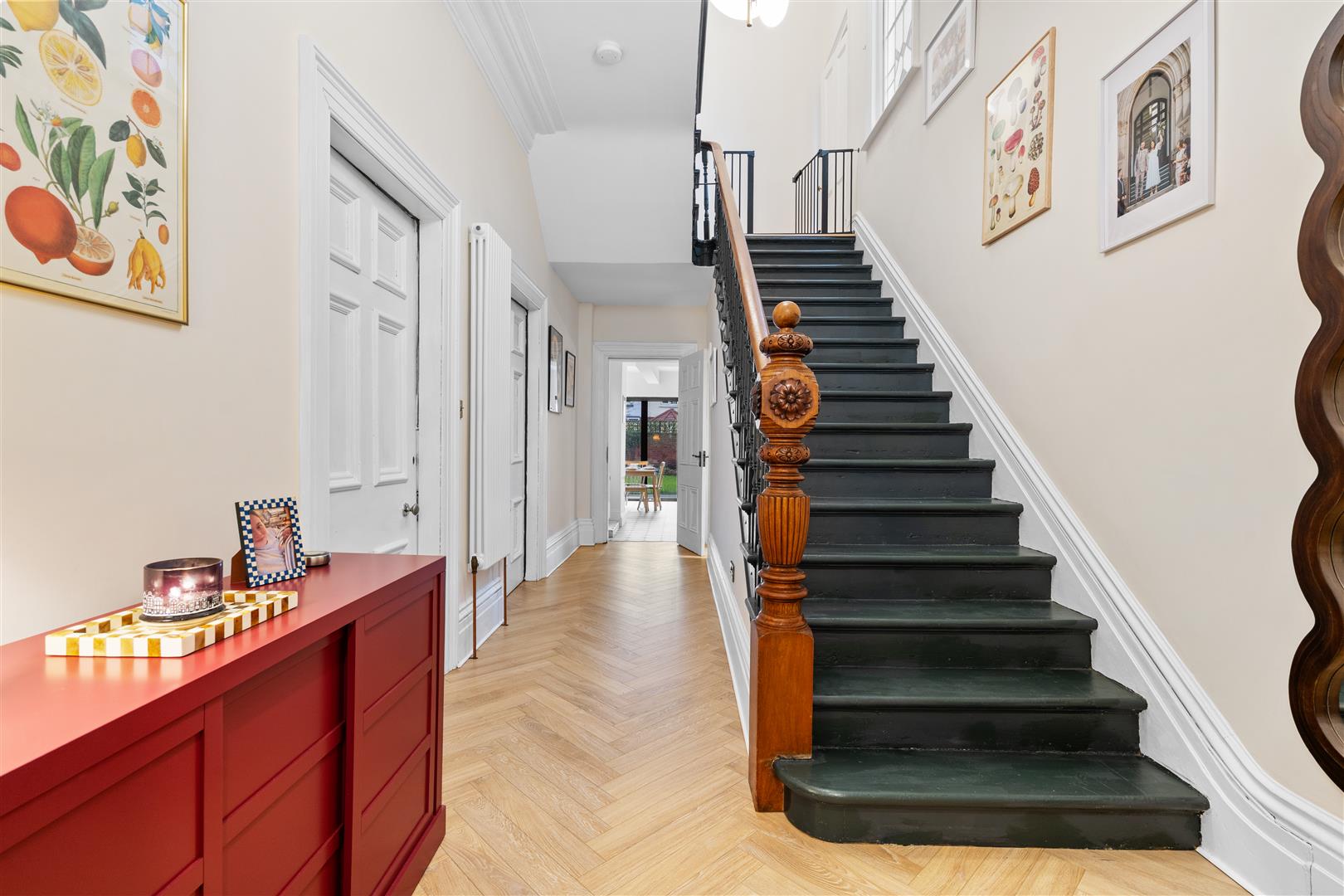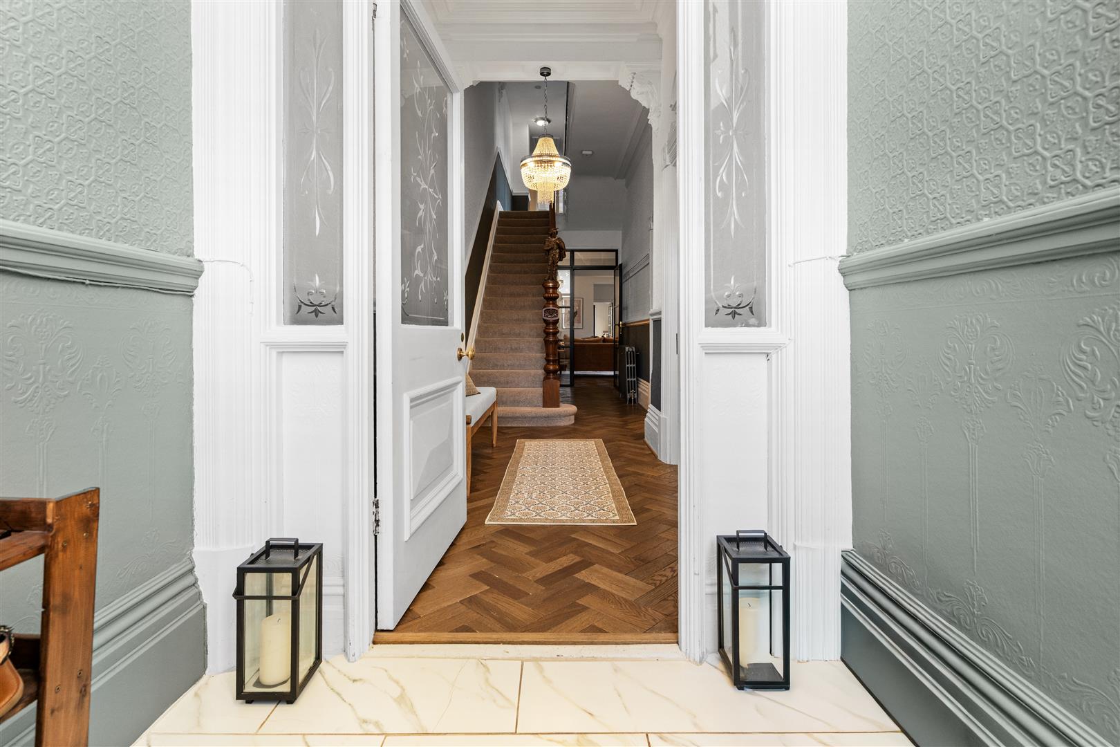 Inviting entrance hallway entered via etched glass doors with original stairs the first floor accommodation, impeccable decor, column radiator, beautiful herringbone flooring, deep cornicing and skirting/architrave which is evident throughout the property.