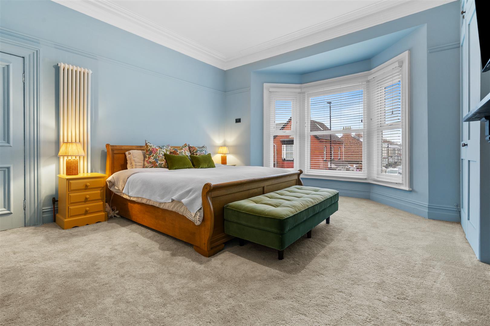 Bedroom one is a large double with bay window to the front elevation, twin fitted wardrobes, traditional fireplace with tiled up stand and original cast fire, picture rail, pastel decor.