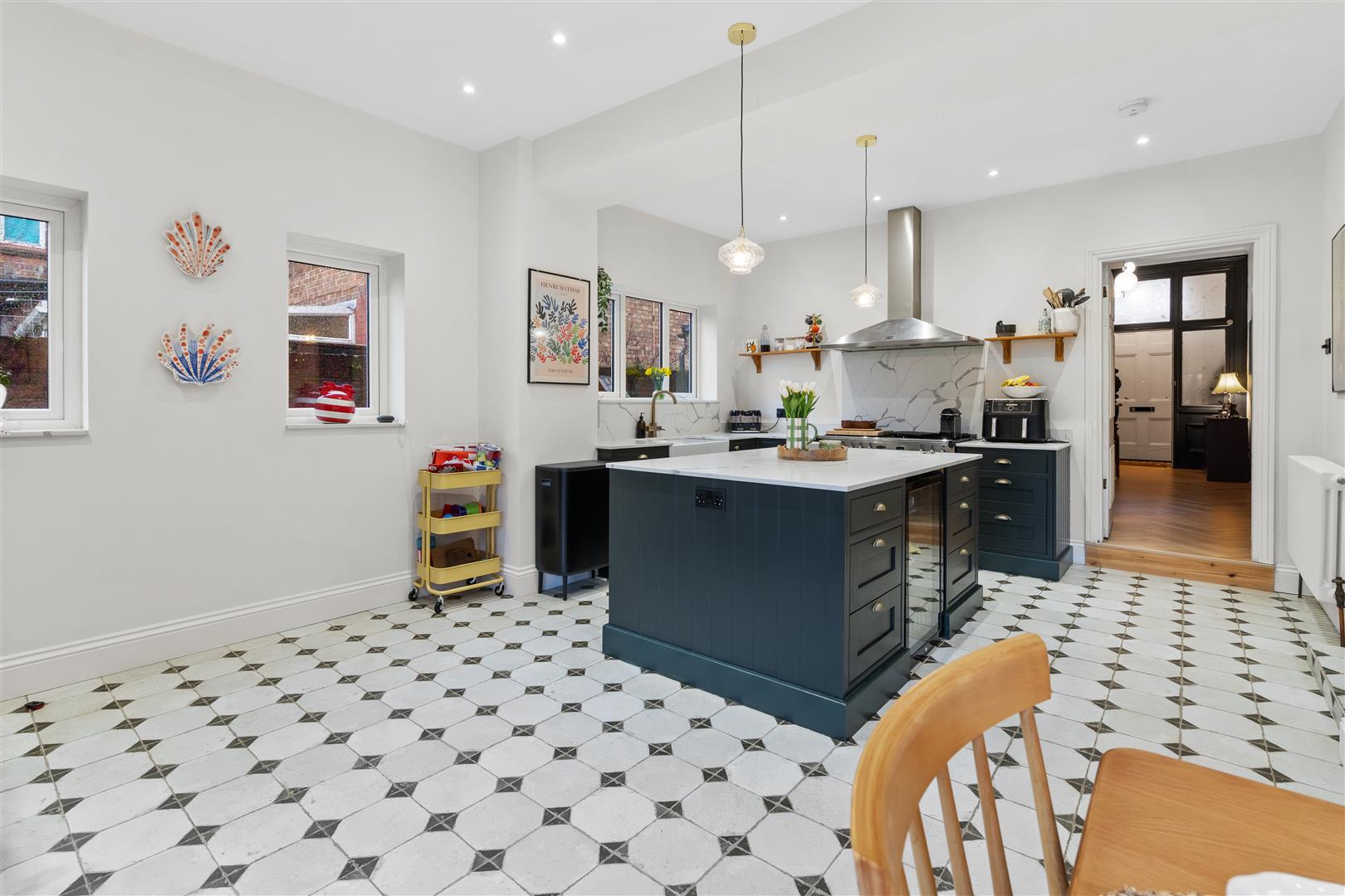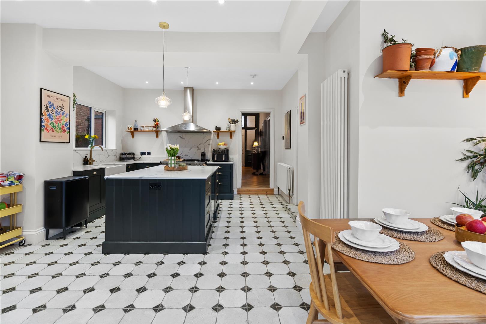Large recently refitted kitchen dining room fitted with a stunning array of shaker style wall, base and drawer cabinetry, complimentary quartz work surfaces and co ordinating backsplash, fabulous central island, integrated wine cooler, integrated dishwasher, space for range, integrated stainless oversized extractor, Belfast sink, instant hot water tap, space for American fridge freezer, recessed spotlights, column radiators, wall lights, tiled floor, ample dining space, lovely decor, bifold door opening into the garden.