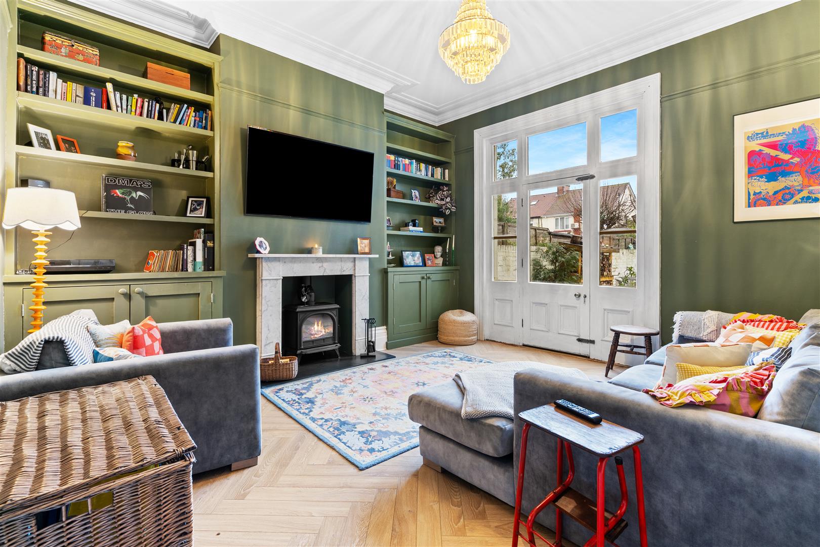 Beautiful lounge with a bay window to the front elevation, marble fireplace with dual fuel fire, deep cornicing, picture rail, superb wooden flooring, excellent decor.