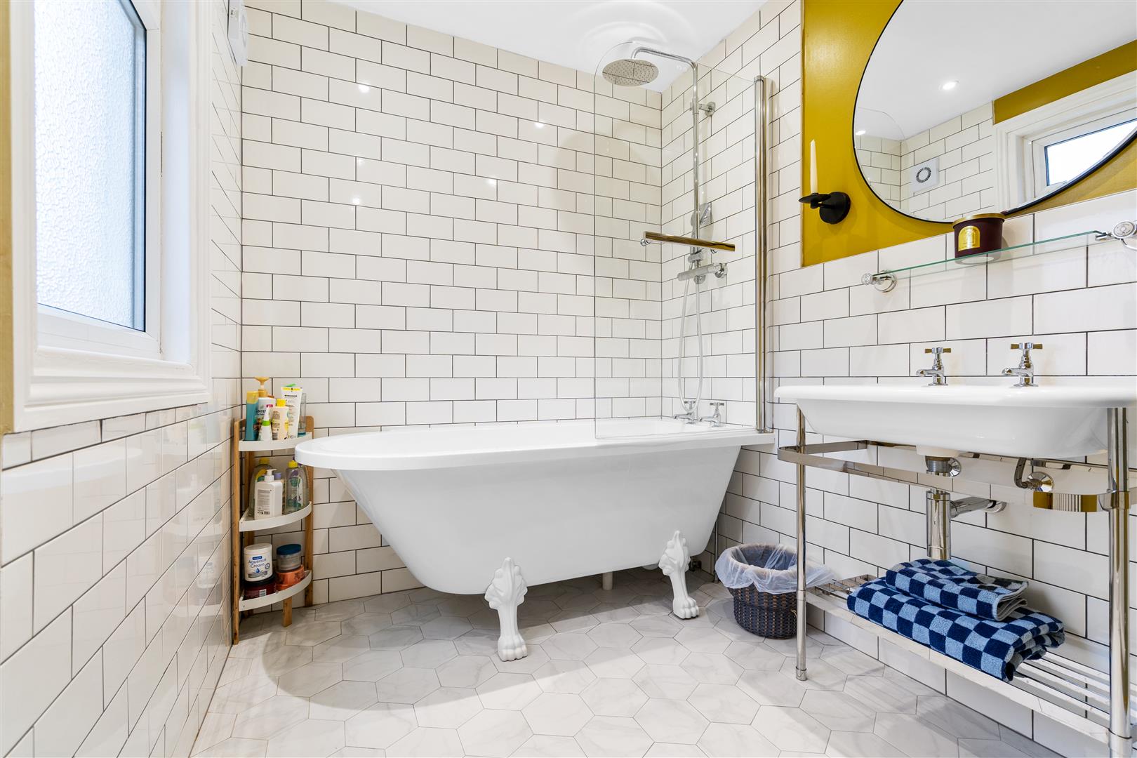 The family bathroom comprises freestanding roll top both, over bath shower, glass shower screen, traditional washbasin, subway tiling, modern decor.