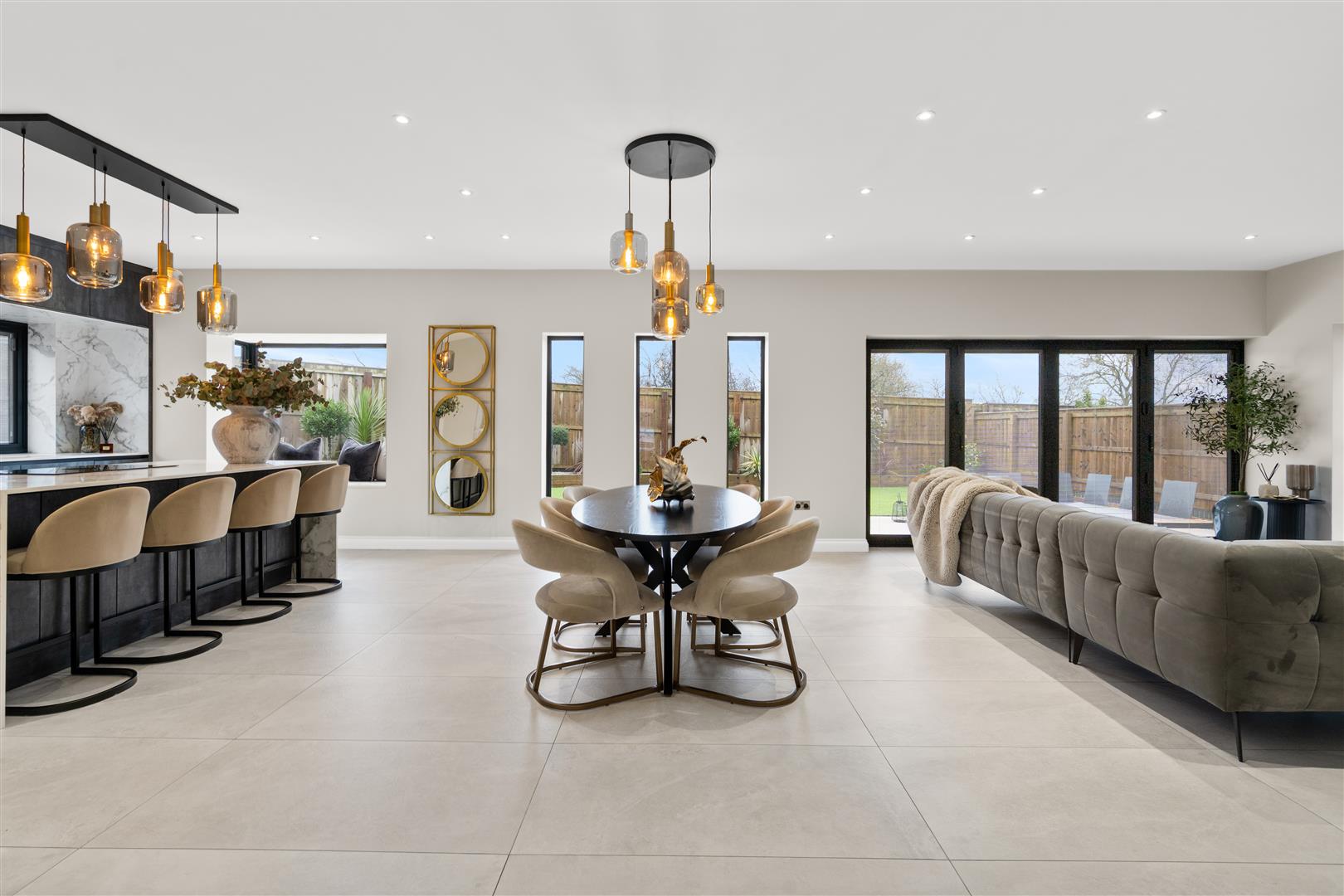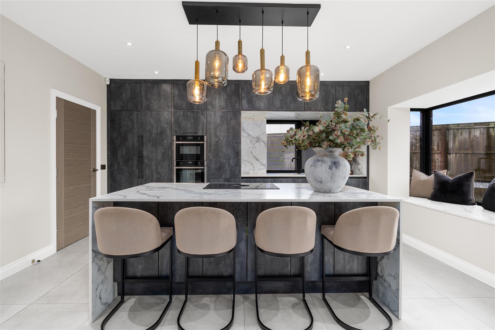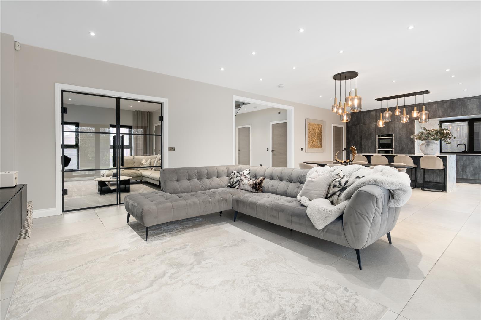 From the moment you step inside the grand entrance hall, the quality and craftsmanship are impossible to miss. To your left, a stylish lounge invites you to unwind in elegance. To the right, a chic study as well as a well-placed guest washroom next door. At the heart of the home is a spectacular, bespoke open-plan kitchen/dining space/family space. This bespoke kitchen has been completed with quartz worktops, a central breakfast island, and state of the art appliances, pantry with hidden doors as well as access into the spacious utility room with outdoor access which creates everyday convenience. Bi-fold sliding doors lead directly out to the landscaped rear garden which seamlessly blends indoor and outdoor living creating the ultimate hosting space. The inter-connected light-filled family lounge lies adjacent to the family area and completes this amazing social hub.