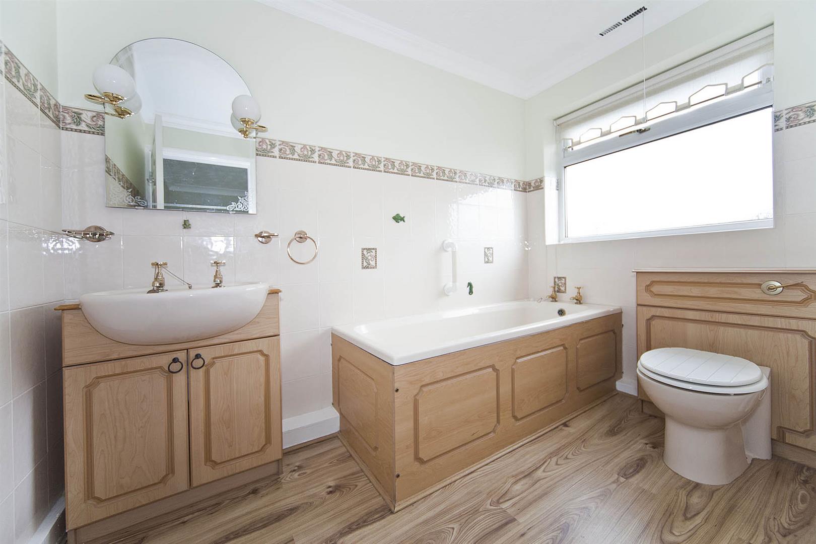 The family bathroom comprises bath, concealed cistern WC and vanity wash basin, complimentary tiling.
