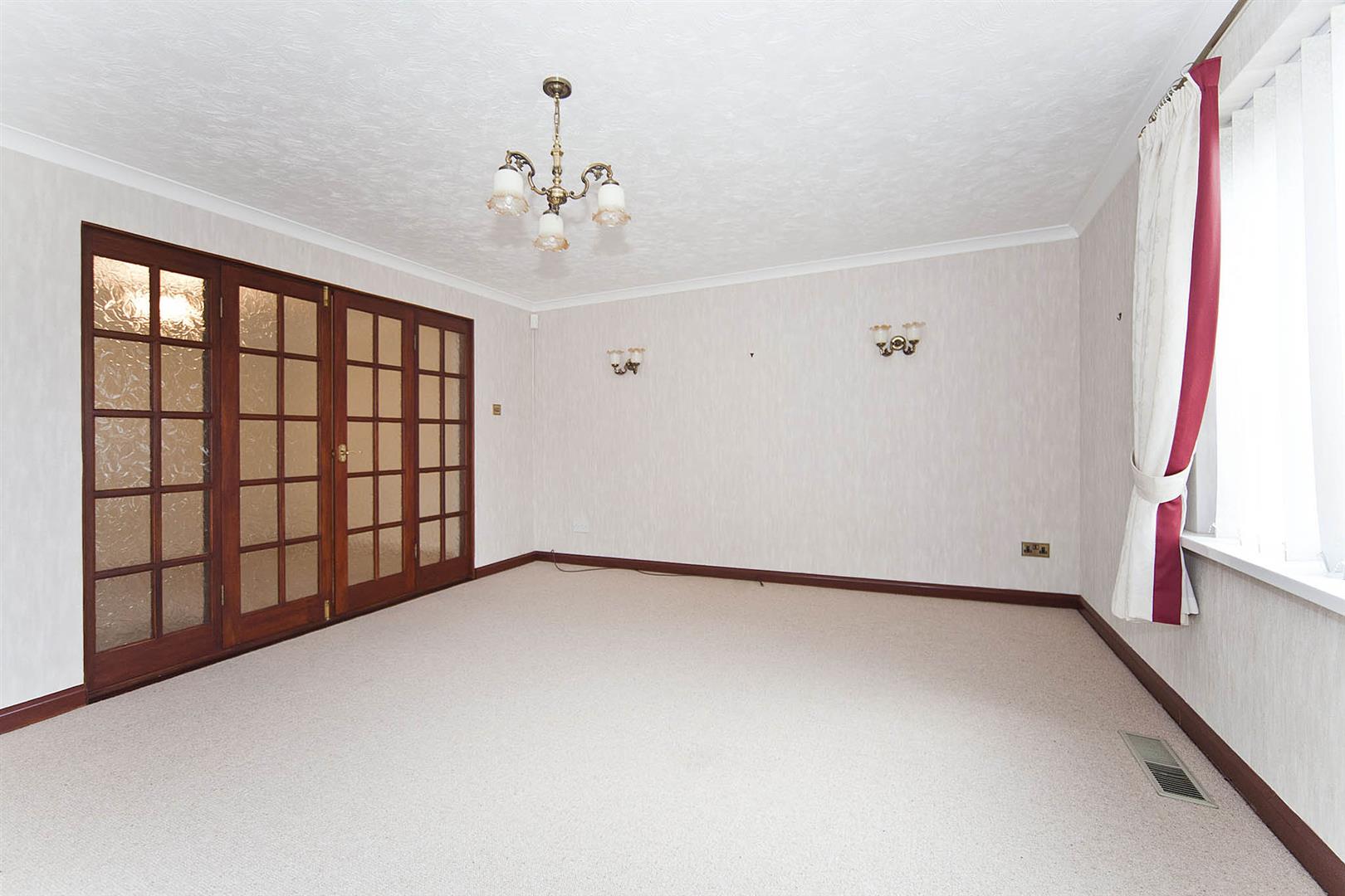 Well proportioned dining room with neutral colour palette, decorative coving, serving hatch to kitchen, French doors opening into;