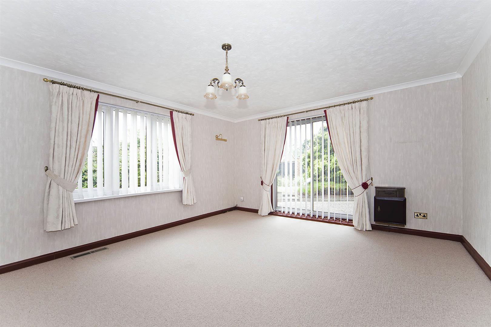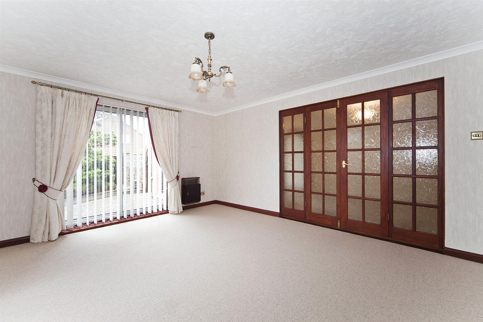 Spacious lounge with patio doors opening to the rear, side elevation window, feature fireplace with inset coal effect fire, decorative coving, neutral colour scheme, wall lights, semi open plan to;