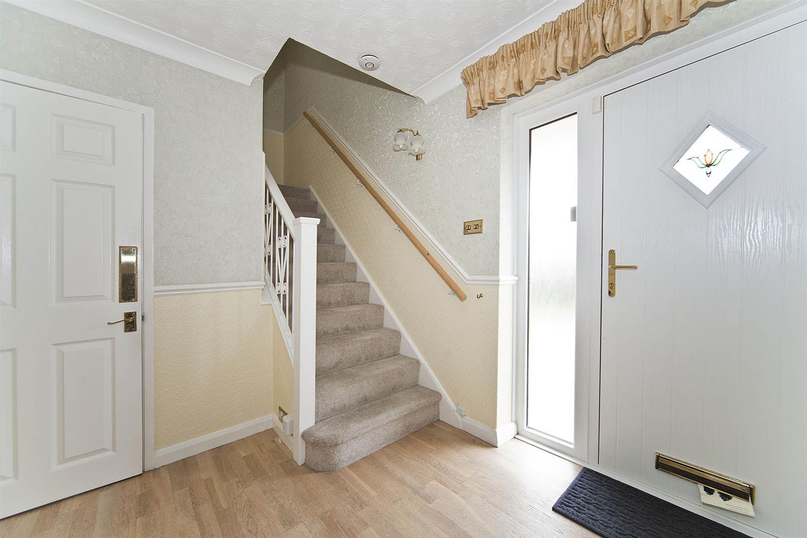 Superb location, excellent end plot, wrap around lawned garden with mature shrubs, large driveway for 3 to 4 vehicles, double detatched garage, front door into;