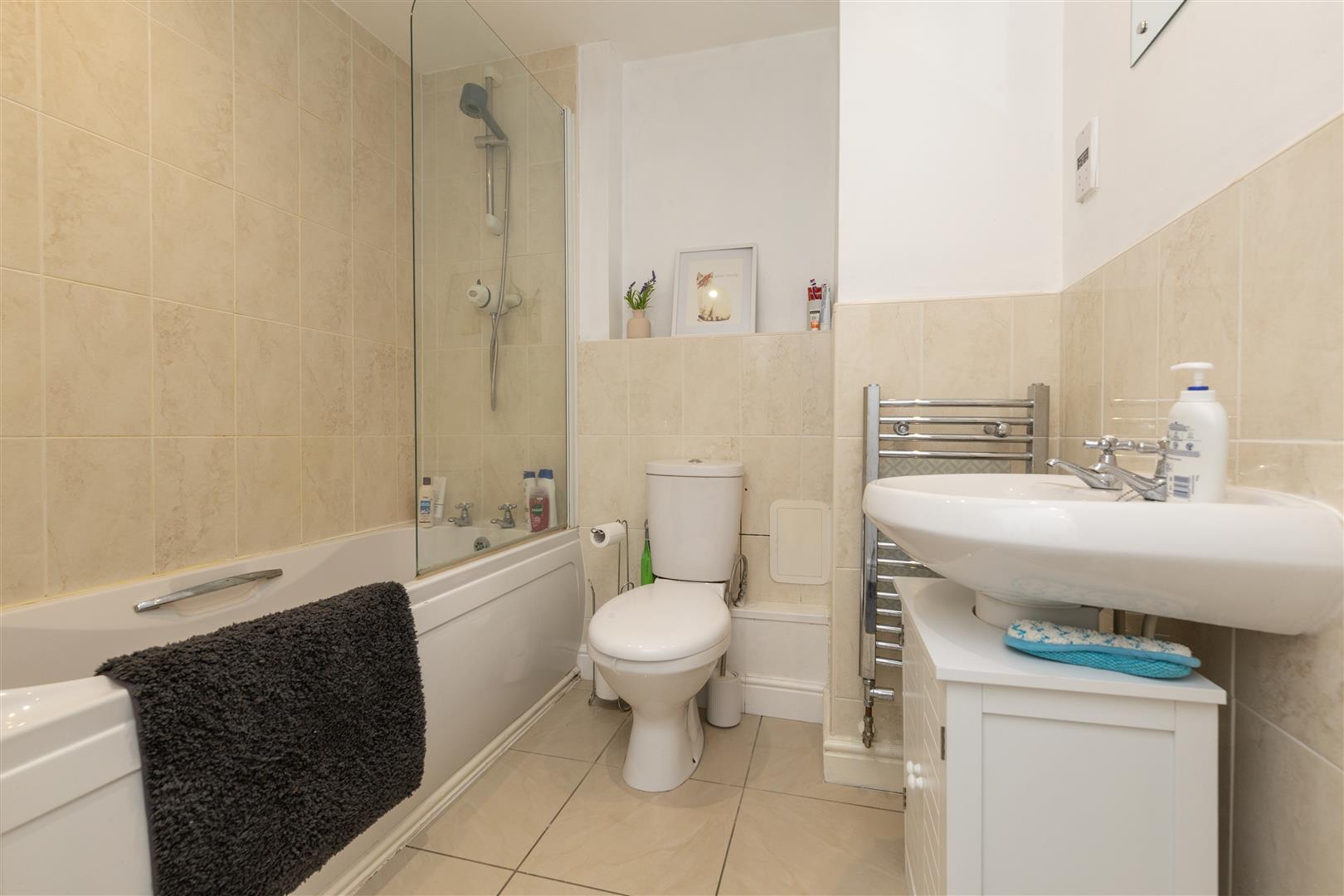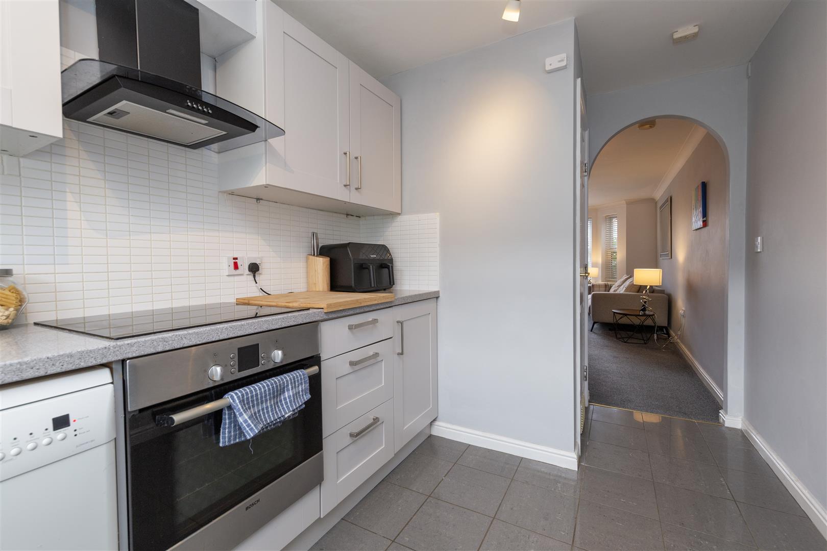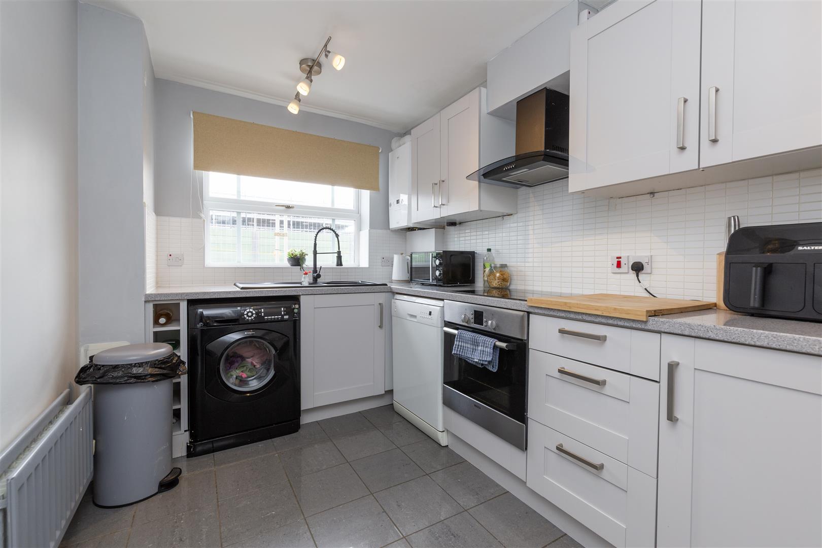 Well presented imposing frontage with maintained shrubs and green space, shared entrance door and lobby with access to rear communal space. Through front door into; Bright hallway with intercom, fully carpeted and access to; Delightful lounge with front facing bay window allowing for plenty of natural light, fitted with venetian blinds, fully carpeted in grey with smart bright décor, decorative coving, modern light fittings and two radiators, space for dining and archway into; Well equipped smart kitchen fitted with modern shaker style wall, base and drawer line cabinets in off white, complimentary surfaces, tiled backsplash, integrated oven, integrated induction hob, co-ordinating extractor, contrasting composite sink, plumbing and space for washing machine and dishwasher, modern tiled flooring, fitted storage cupboard currently housing fridge, window to rear, fitted with roller blind, radiator and modern light fitting. Master double bedroom situated to the rear of the property, clean decor, with double fitted wardrobes and drawered vanity unity, large window fitted with venetian blinds, decorative archway, fully carpeted. Second smaller double bedroom with views to front of property with fitted sliding door wardrobes, fitted grey carpet and clean bright décor. Well equipped bathroom comprising, mains shower over bath with glass screen, close coupled WC and vanity wash basin combination unit, complimentary tiling, throughout walls and floor, heated towel rail, fitted mirror and shaving power point. To the rear is a shared green courtyard. This property is ideal for first time buyers or investors and those looking to down-size and would appreciate a low maintenance home. This appealing modern ground floor apartment is very well maintained and is ready to be lived in. Please contact Igomove without delay to arrange a viewing.