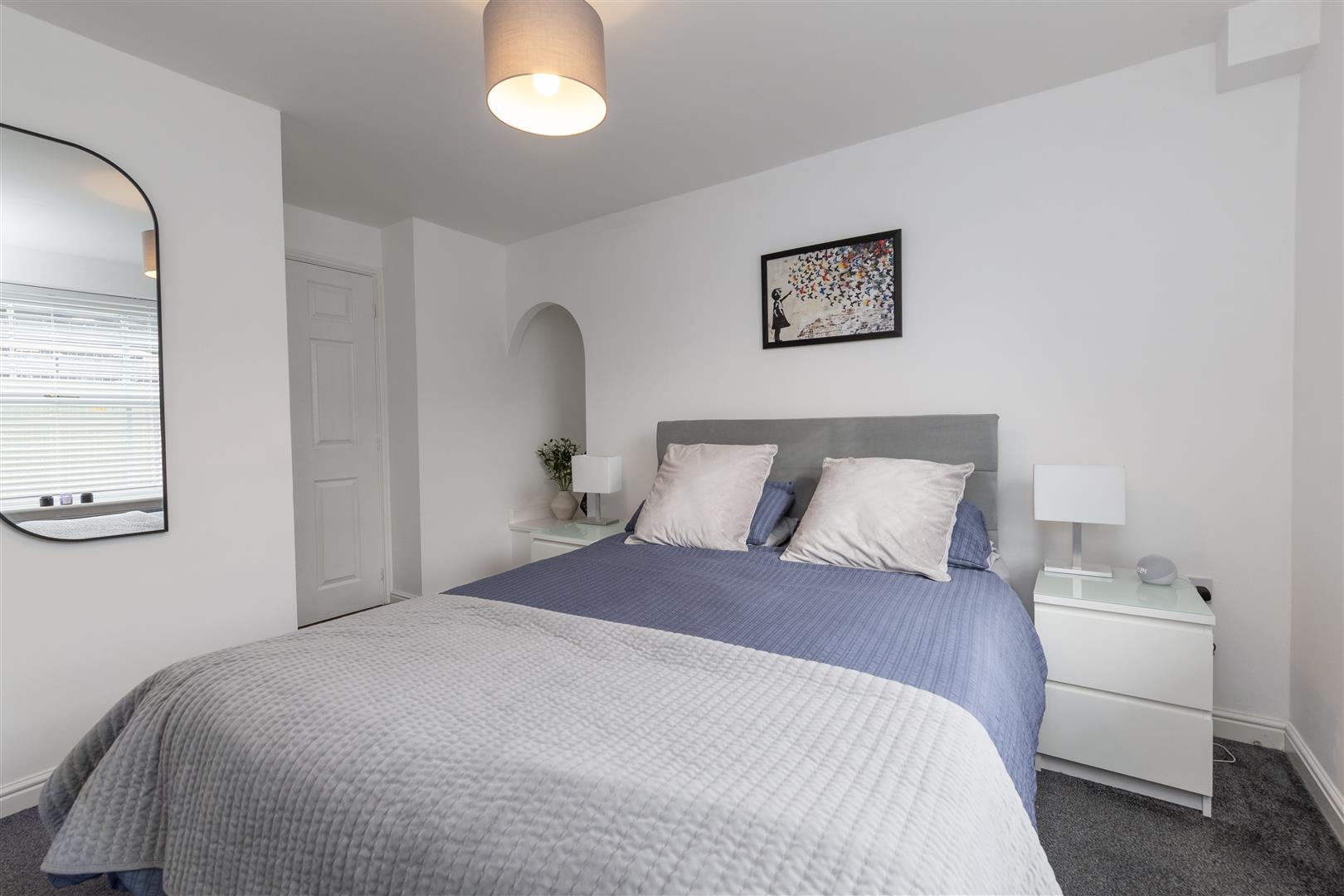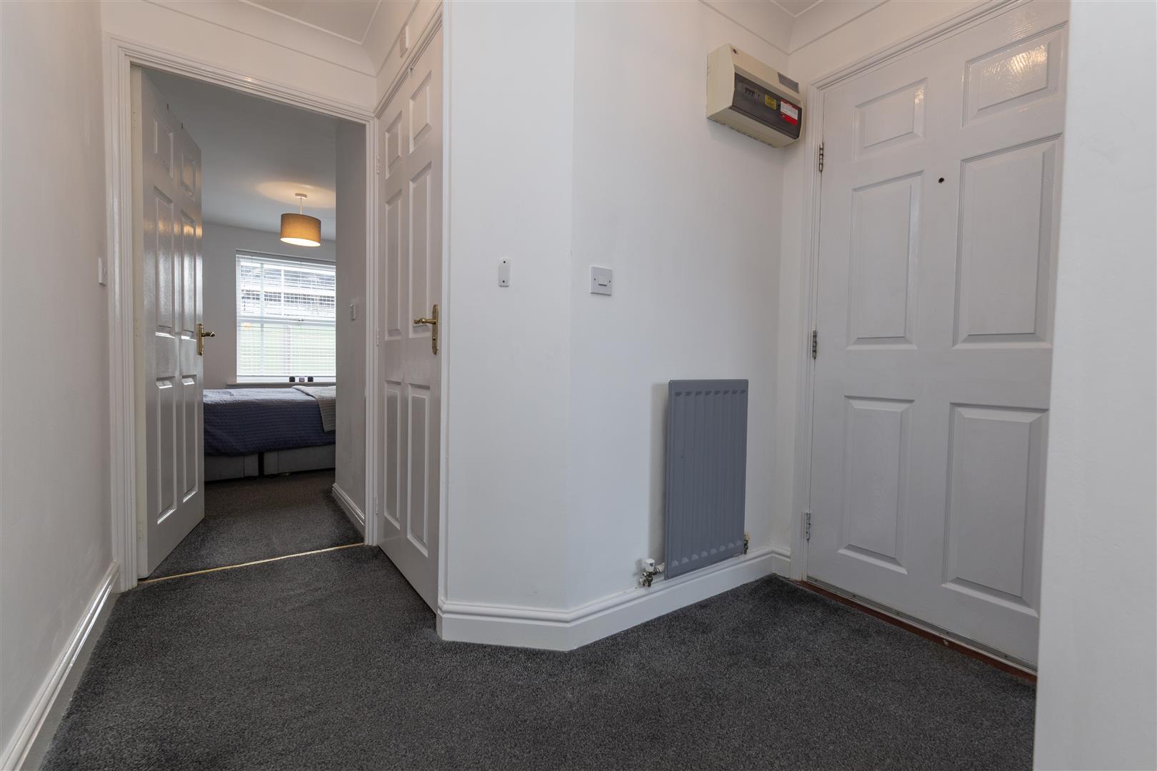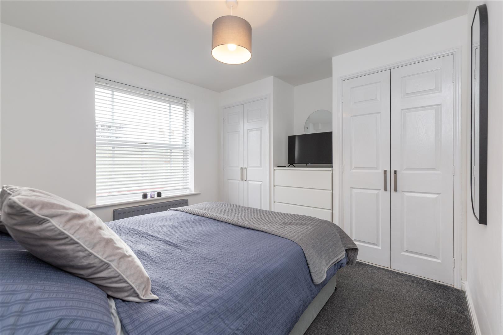 Well presented imposing frontage with maintained shrubs and green space, shared entrance door and lobby with access to rear communal space. Through front door into; Bright hallway with intercom, fully carpeted and access to; Delightful lounge with front facing bay window allowing for plenty of natural light, fitted with venetian blinds, fully carpeted in grey with smart bright décor, decorative coving, modern light fittings and two radiators, space for dining and archway into; Well equipped smart kitchen fitted with modern shaker style wall, base and drawer line cabinets in off white, complimentary surfaces, tiled backsplash, integrated oven, integrated induction hob, co-ordinating extractor, contrasting composite sink, plumbing and space for washing machine and dishwasher, modern tiled flooring, fitted storage cupboard currently housing fridge, window to rear, fitted with roller blind, radiator and modern light fitting. Master double bedroom situated to the rear of the property, clean decor, with double fitted wardrobes and drawered vanity unity, large window fitted with venetian blinds, decorative archway, fully carpeted. Second smaller double bedroom with views to front of property with fitted sliding door wardrobes, fitted grey carpet and clean bright décor. Well equipped bathroom comprising, mains shower over bath with glass screen, close coupled WC and vanity wash basin combination unit, complimentary tiling, throughout walls and floor, heated towel rail, fitted mirror and shaving power point. To the rear is a shared green courtyard. This property is ideal for first time buyers or investors and those looking to down-size and would appreciate a low maintenance home. This appealing modern ground floor apartment is very well maintained and is ready to be lived in. Please contact Igomove without delay to arrange a viewing.