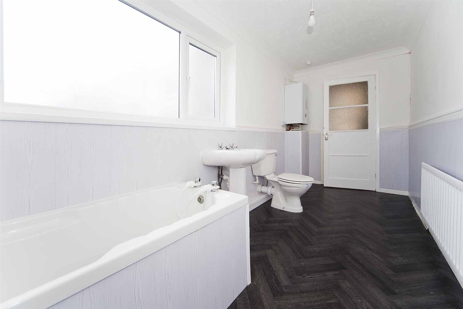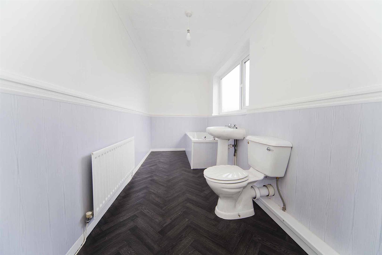 The large family bathroom comprises bath, close coupled WC and pedestal wash basin, dado rail.