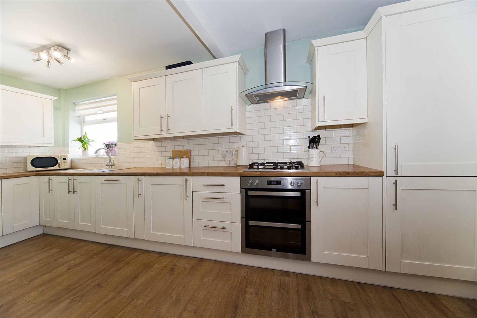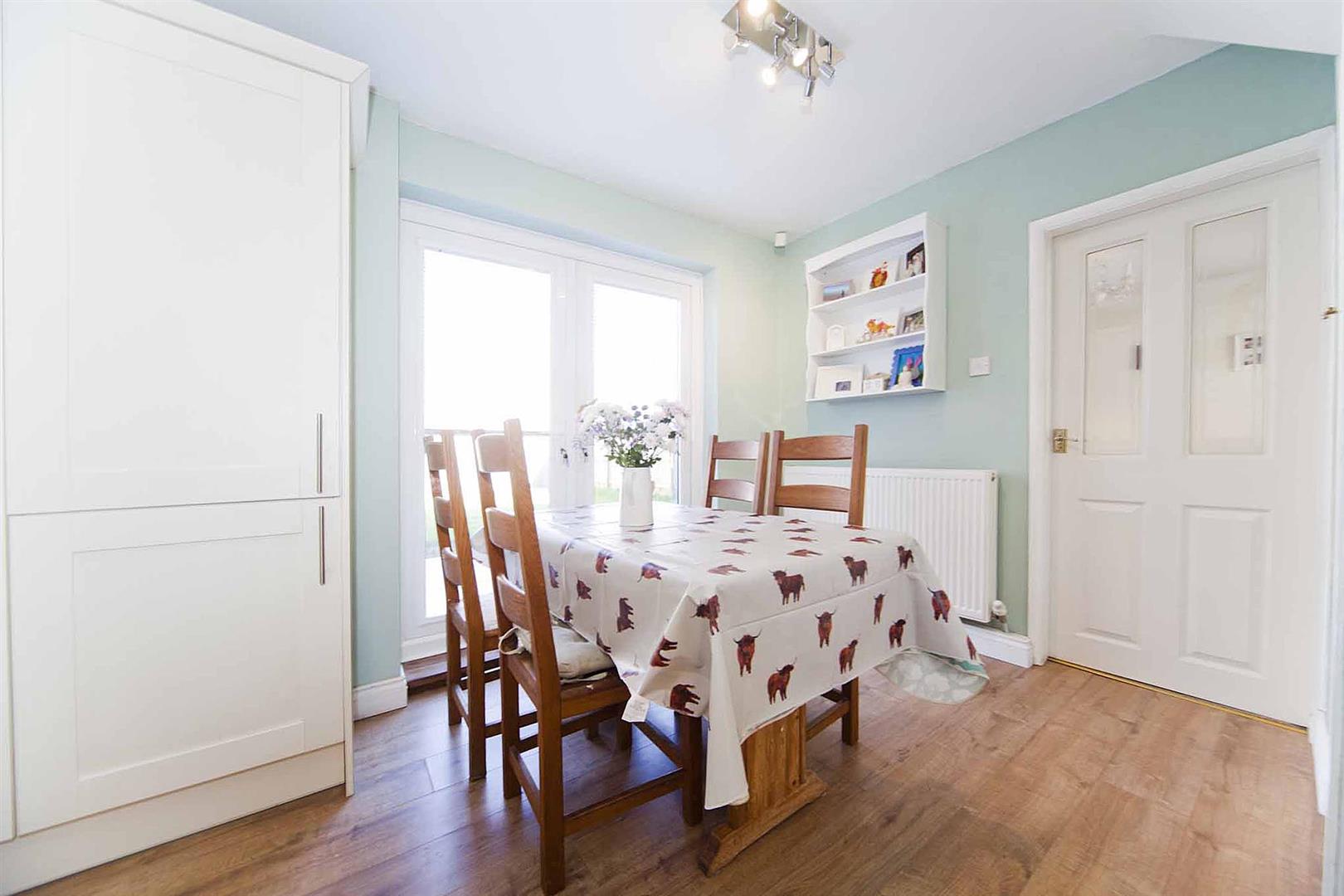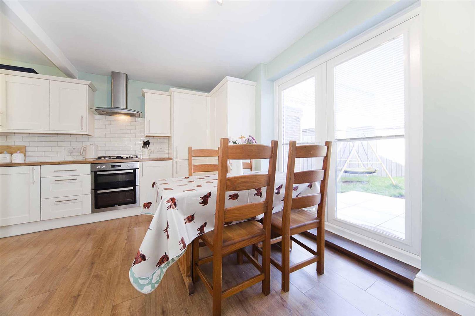 Open plan kitchen diner which comprises a range of shaker style larder, wall, base, and drawer cabinetry, complementary surfaces, stylish subway tiling to backsplash, integrated oven, integrated gas hob, integrated multifunction extractor, sink with mixer tap, integrated washing machine, integrated fridge freezer, integrated dishwasher, fitted storage cupboard, ample space to dine, French doors which lead to the rear garden.