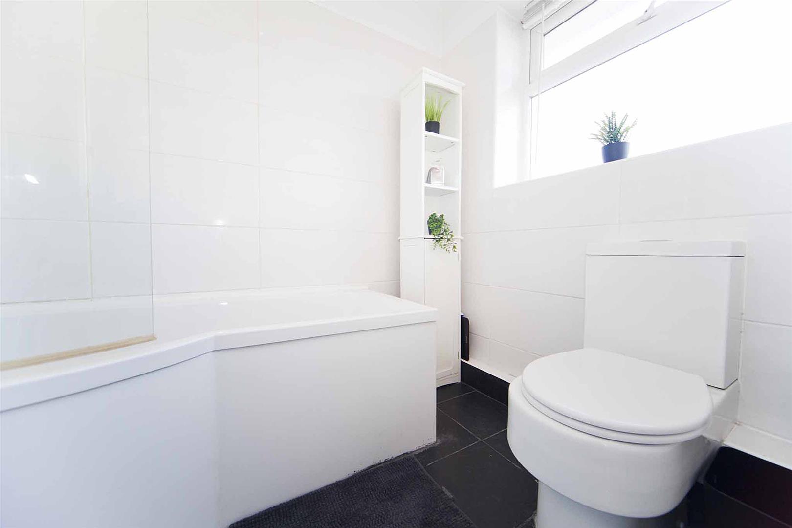 The family bathroom comprises 'P' shaped bath, over bath shower and glass shower screen, close coupled WC and wash basin with complimentary tiling, heated towel radiator.