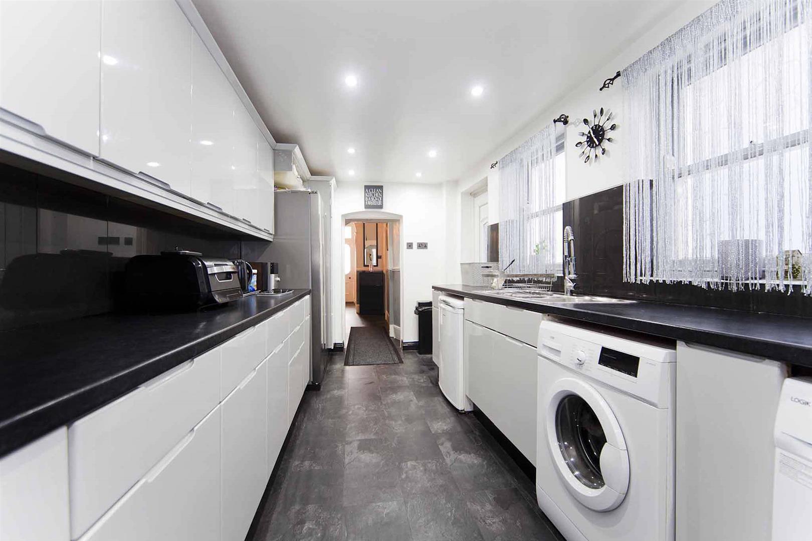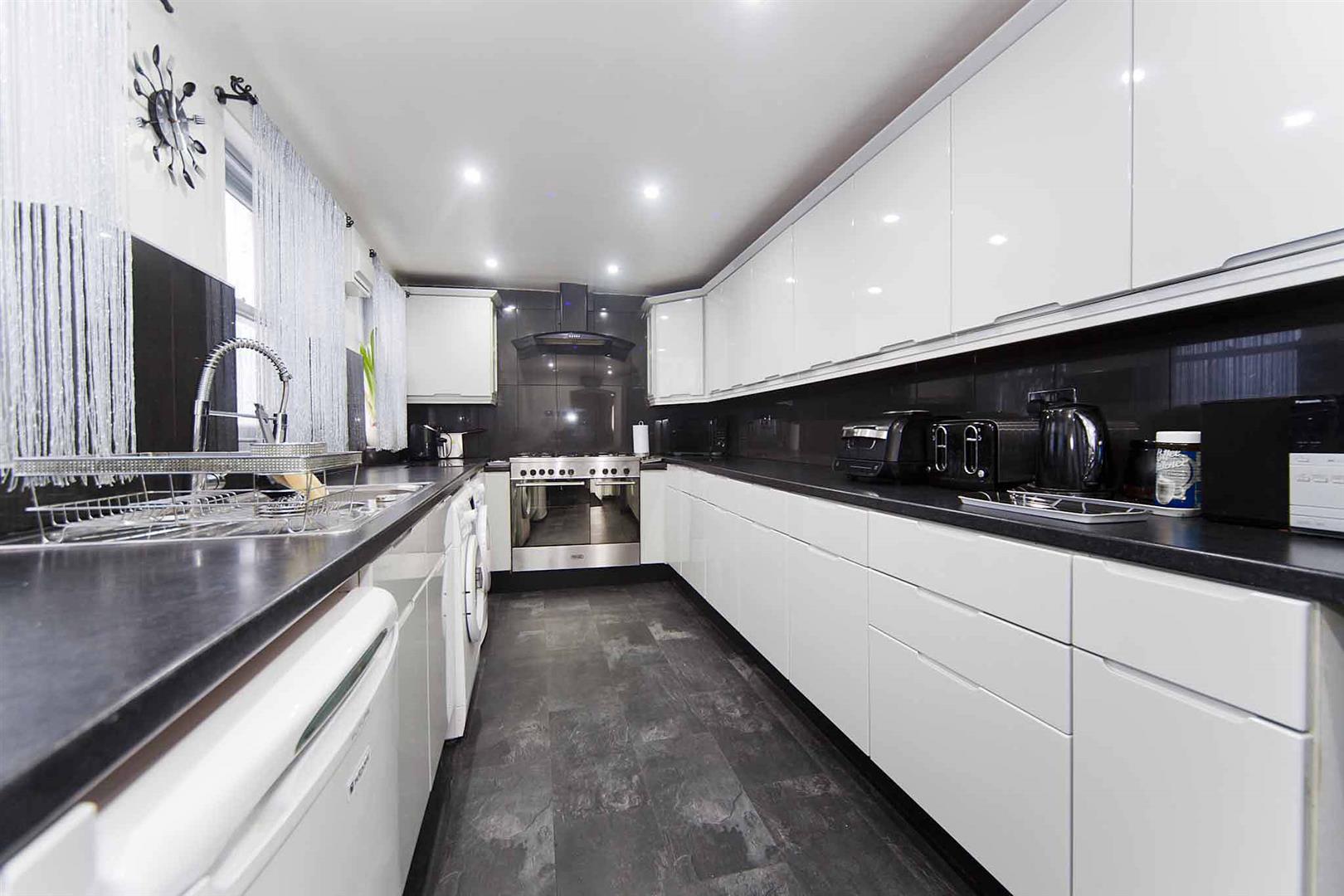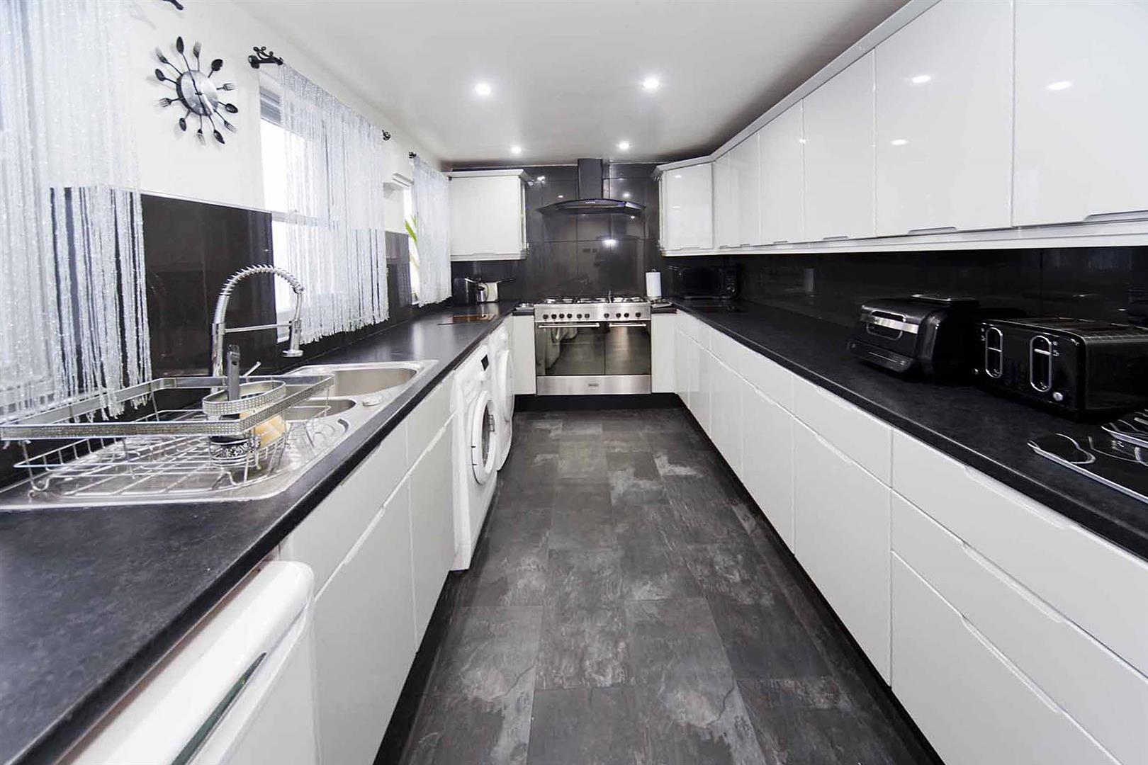 Well equipped high gloss kitchen comprising wall, base, and drawer cabinetry, complimentary surfaces, tiled backsplash, space for range cooker, integrated extractor, one and an half bowl sink with American style jet chrome mixer swivel tap, plumbing for washing machine, space for tumble dryer, space for under counter fridge, space for fridge freezer, recessed spotlights, laminate flooring, triple windows, rear access door.