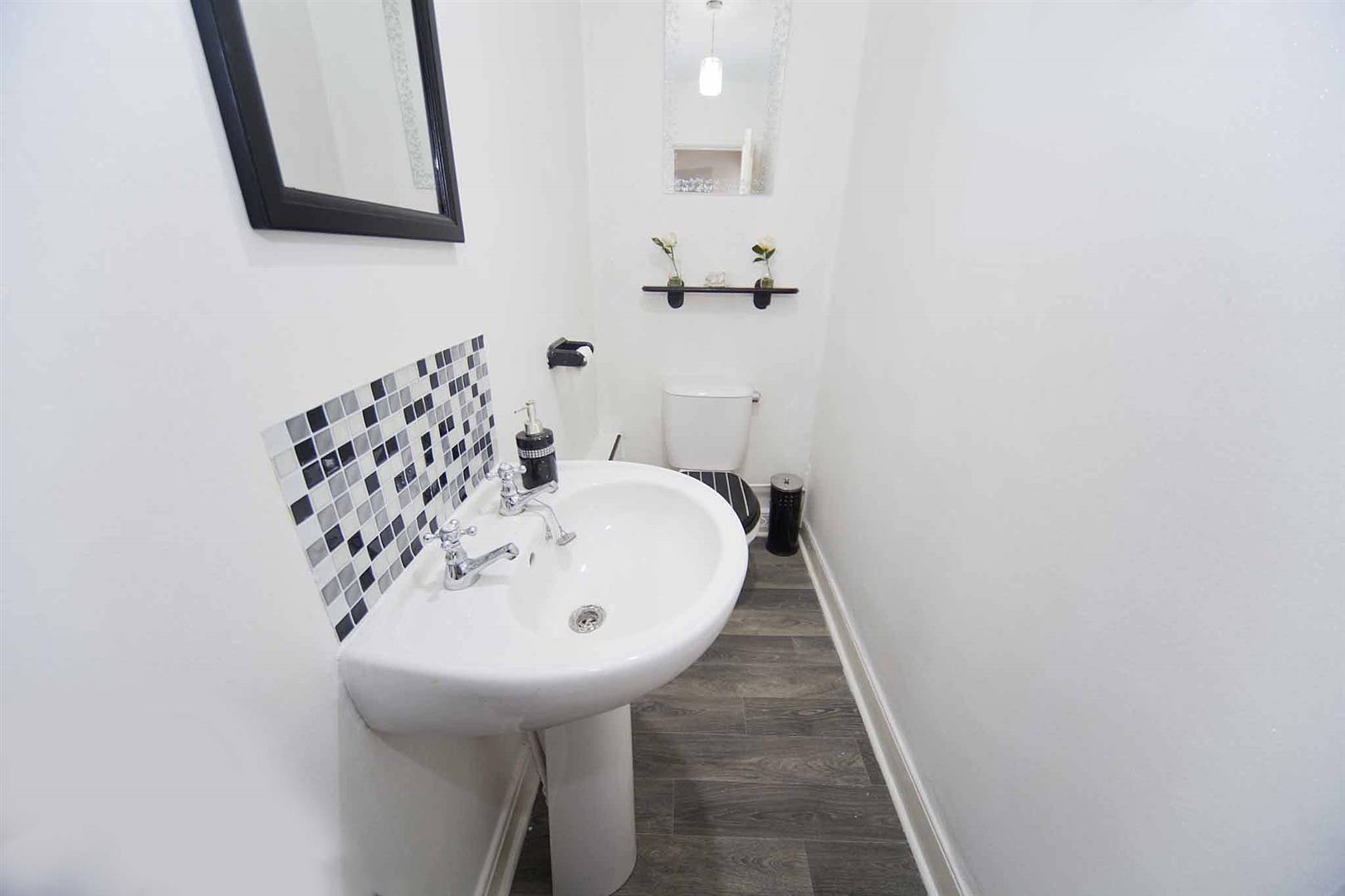 Guest WC/ cloakroom located to this floor comprising close coupled WC and pedestal wash basin, mosaic tiled backsplash, pristine decor.