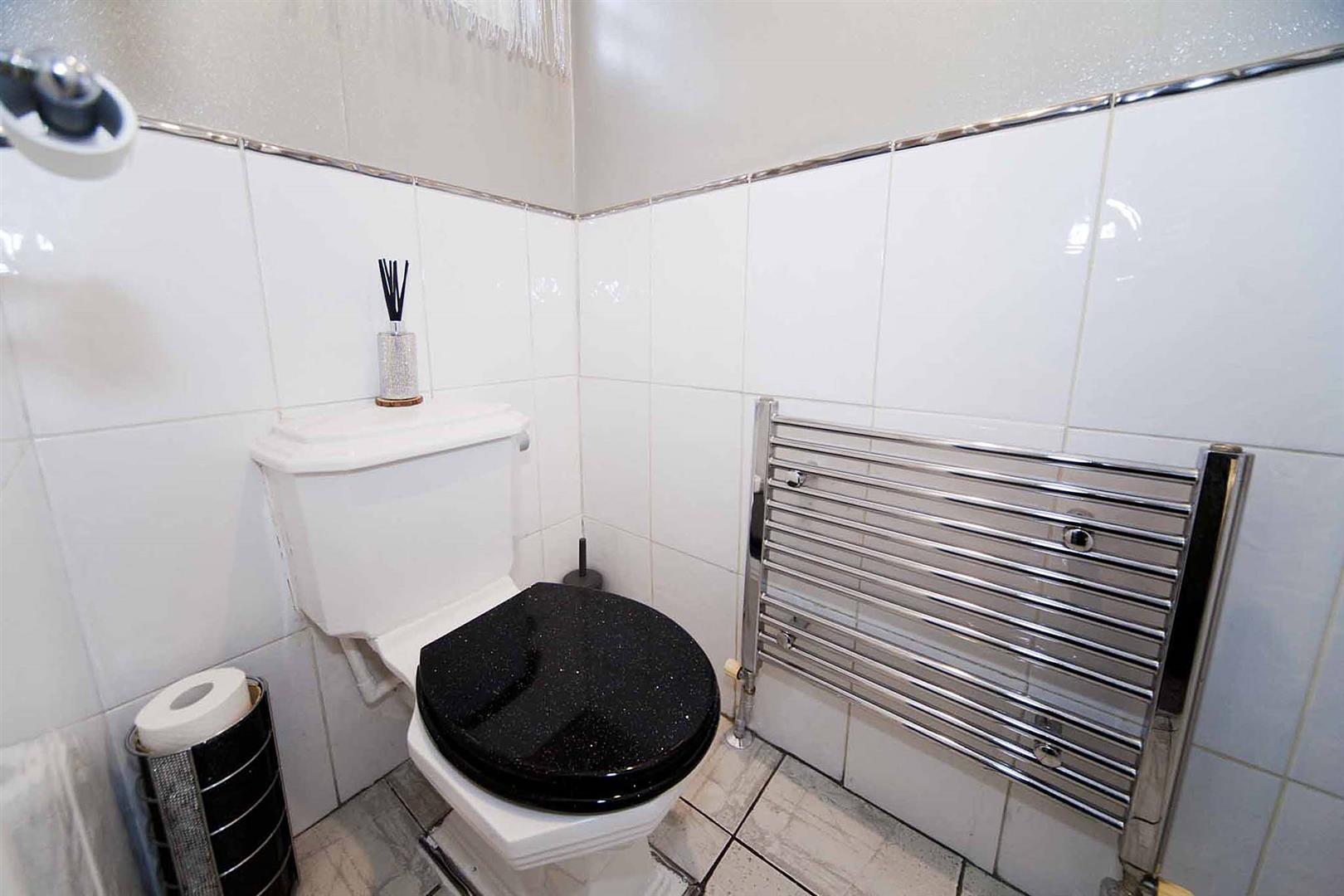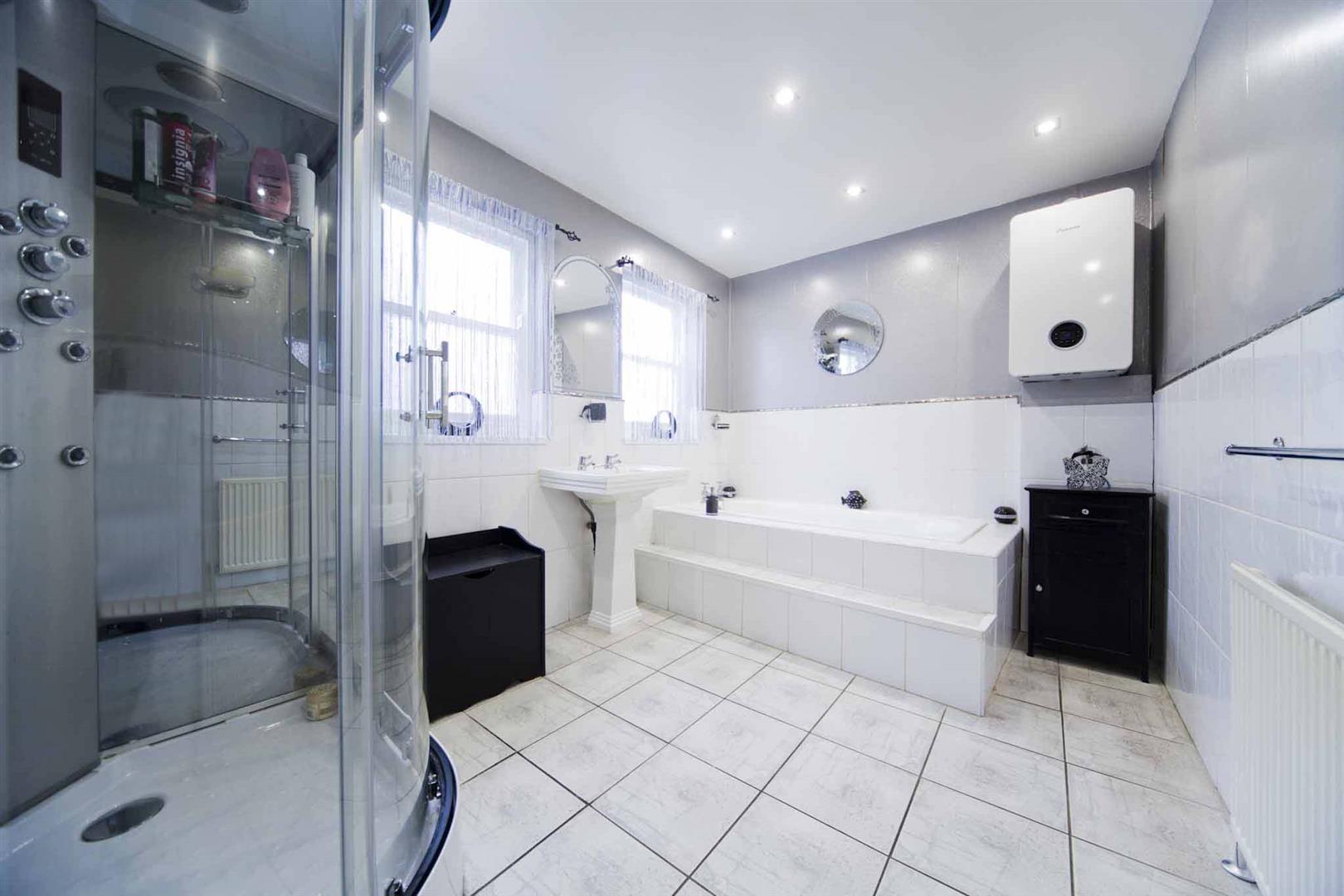 The family bathroom comprises raised platform bath, quadrant multi jet shower enclosure and pedestal wash basin, complimentary tiling to walls and floor, recess spotlights, twin windows, separate WC enclosure with chrome heated towel radiator.