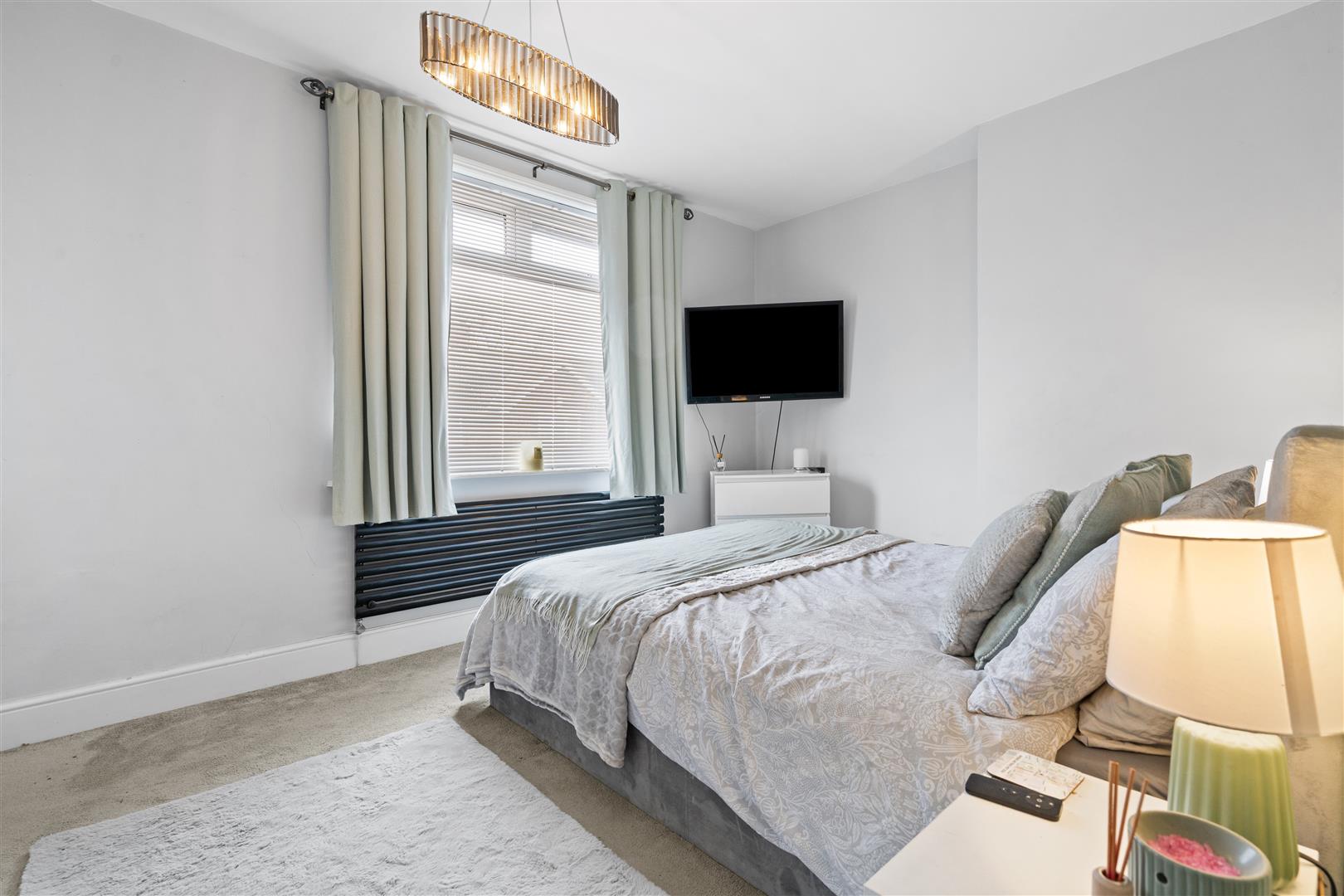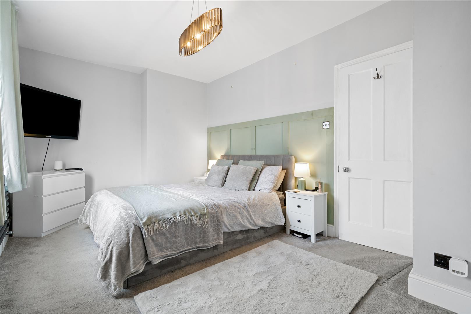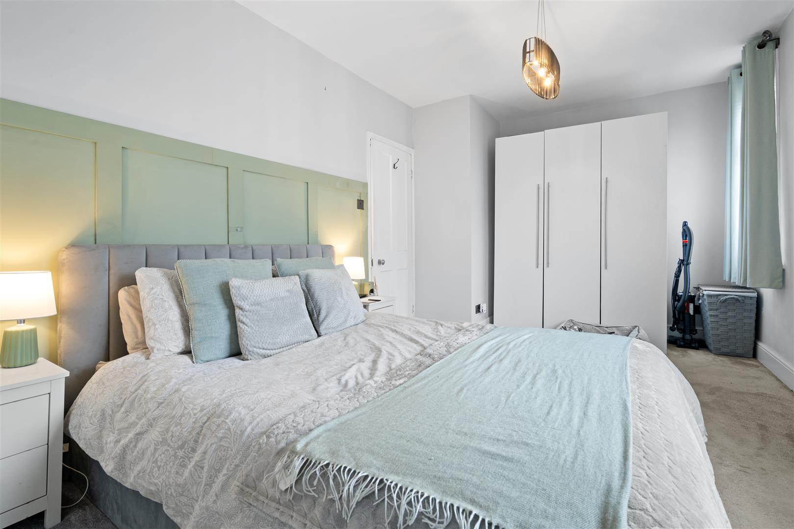 Double bedroom one is situated to the front of the property with twin windows, stylish decor, and bespoke wall panelling.