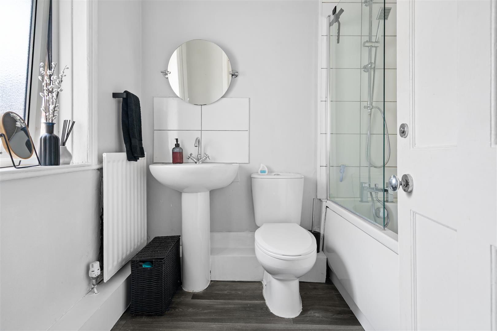 The family bathroom comprises bath with over bath shower, close coupled WC, and pedestal wash basin with complementary tiling.