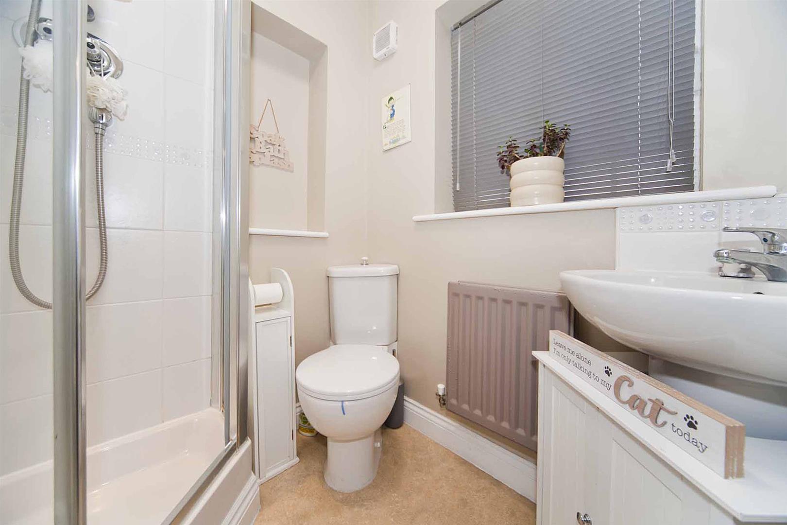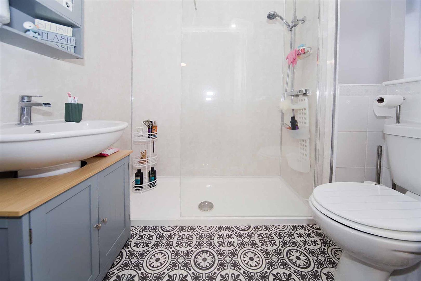 Ensuite shower room which comprises oversized shower enclosure, close coupled WC and pedestal wash basin, complimentary tiling.