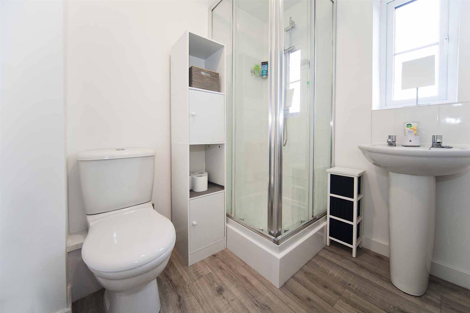 Ensuite shower room which comprises shower enclosure, close coupled WC, and pedestal wash basin, complementary tiling.