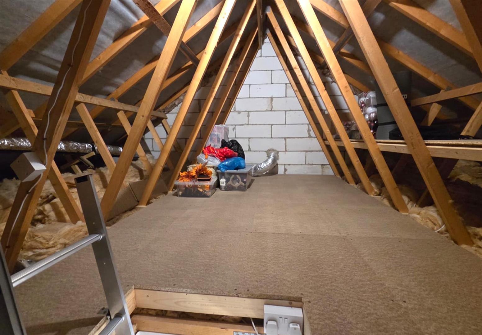 Boarded loft with electrics and ladder.