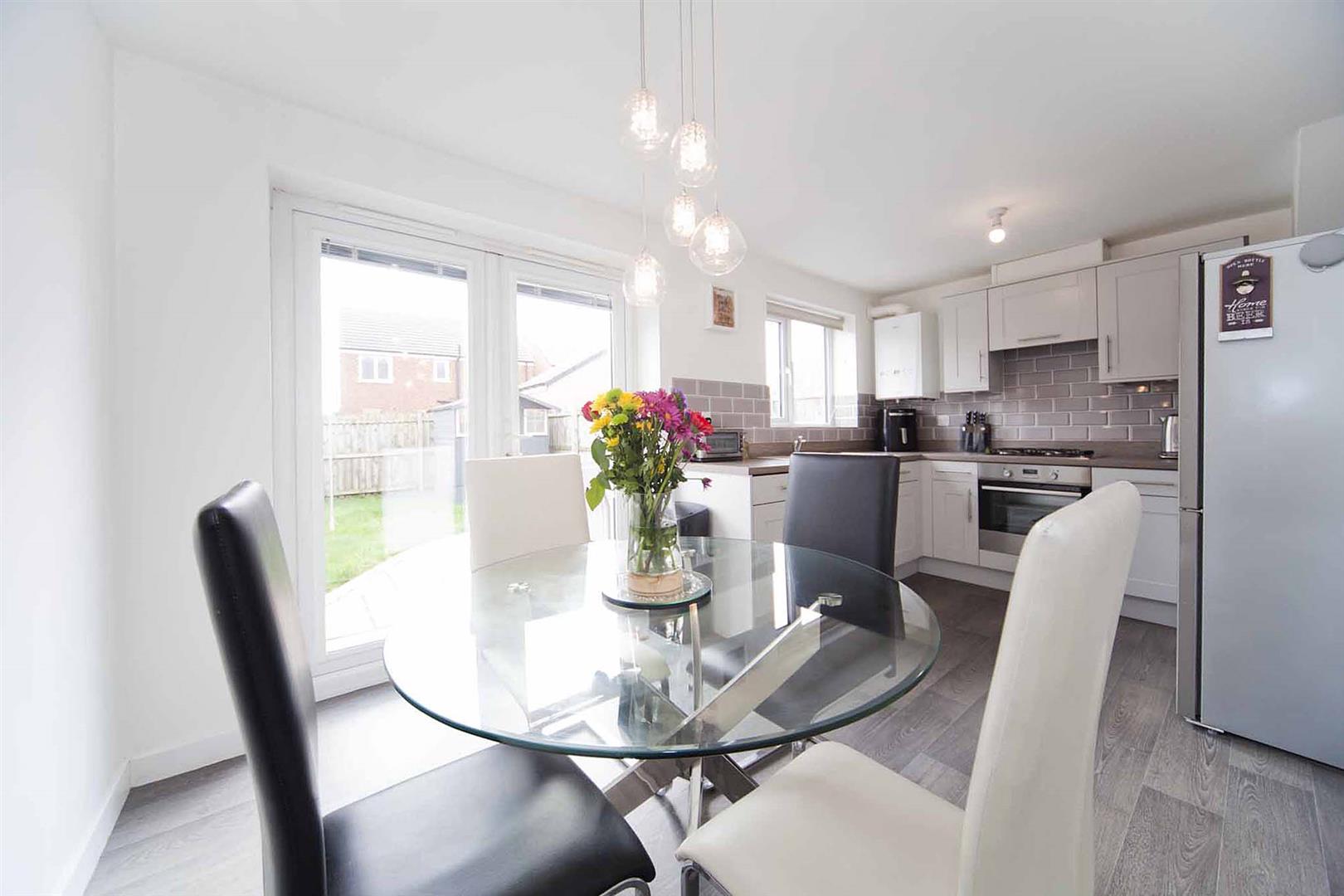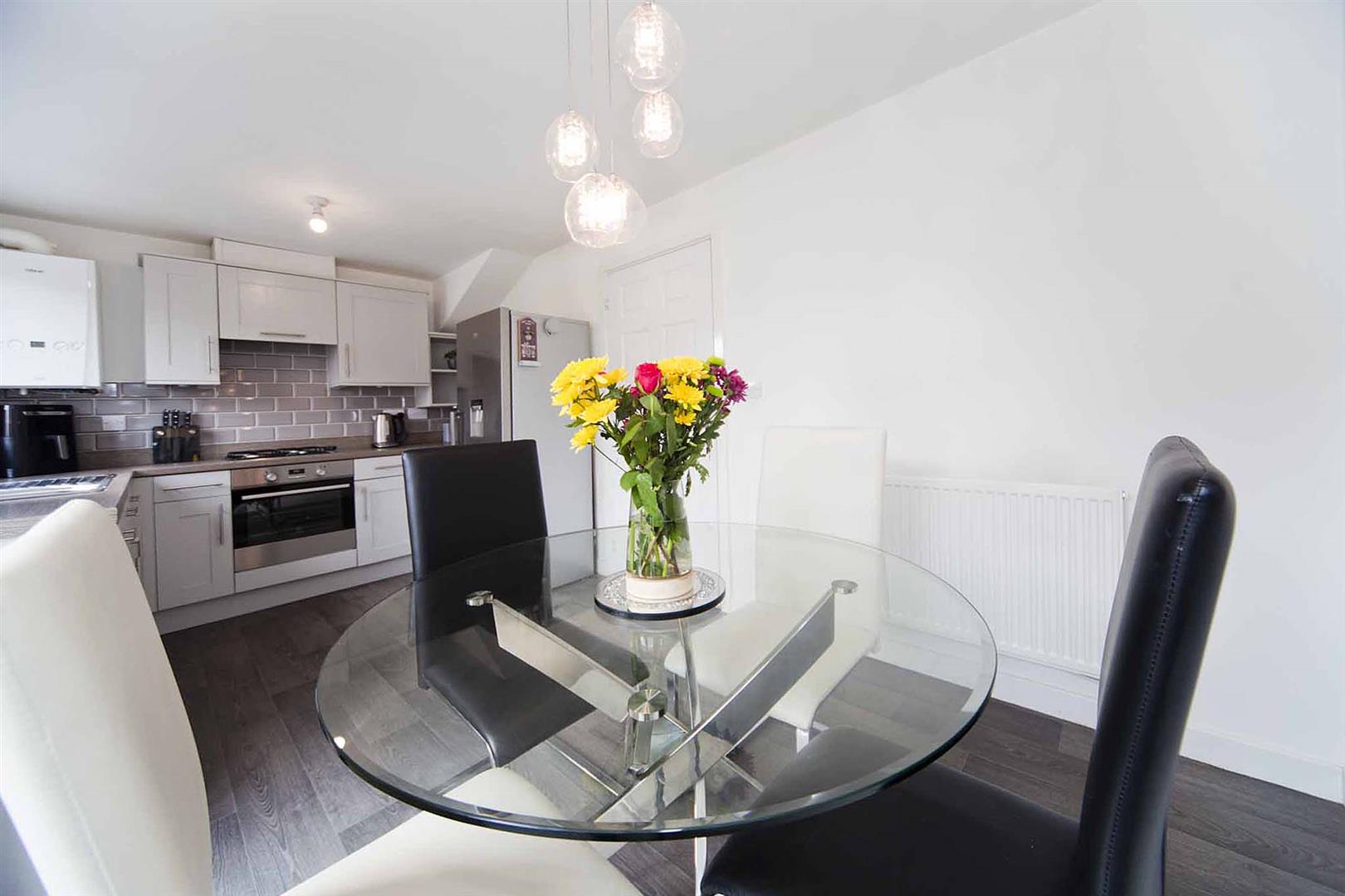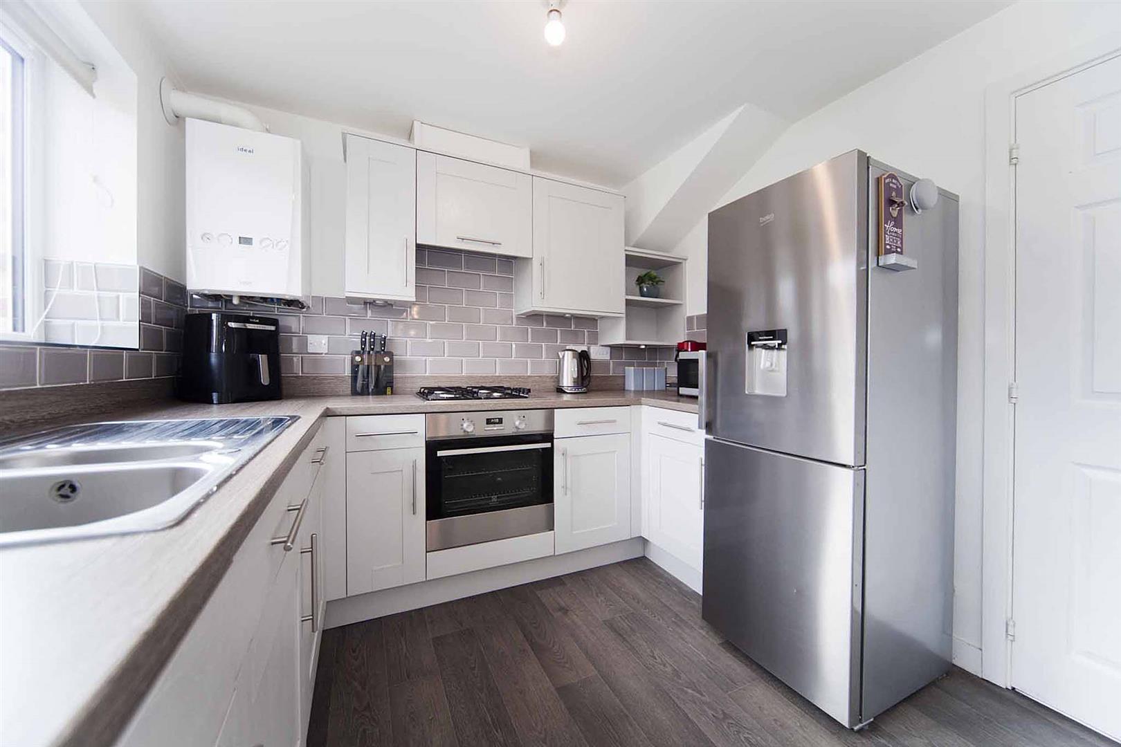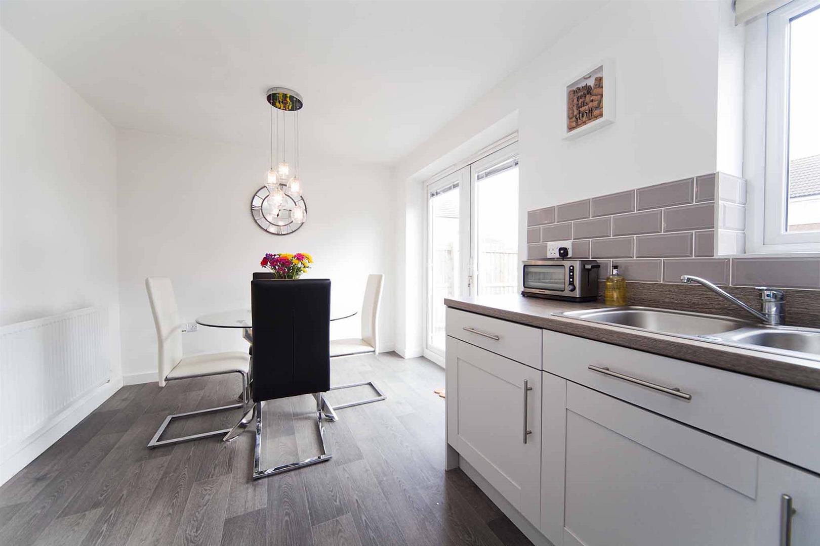 Open concept kitchen diner, which comprises shaker style wall, base, and drawer cabinetry, complementary surfaces, subway tiled backsplash, integrated oven, integrated gas hob, integrated extractor, stainless sink with chrome mixer tap, integrated washing machine, integrated dishwasher, space fridge freezer, ample space to dine, laminate flooring, French doors which open to the rear garden.