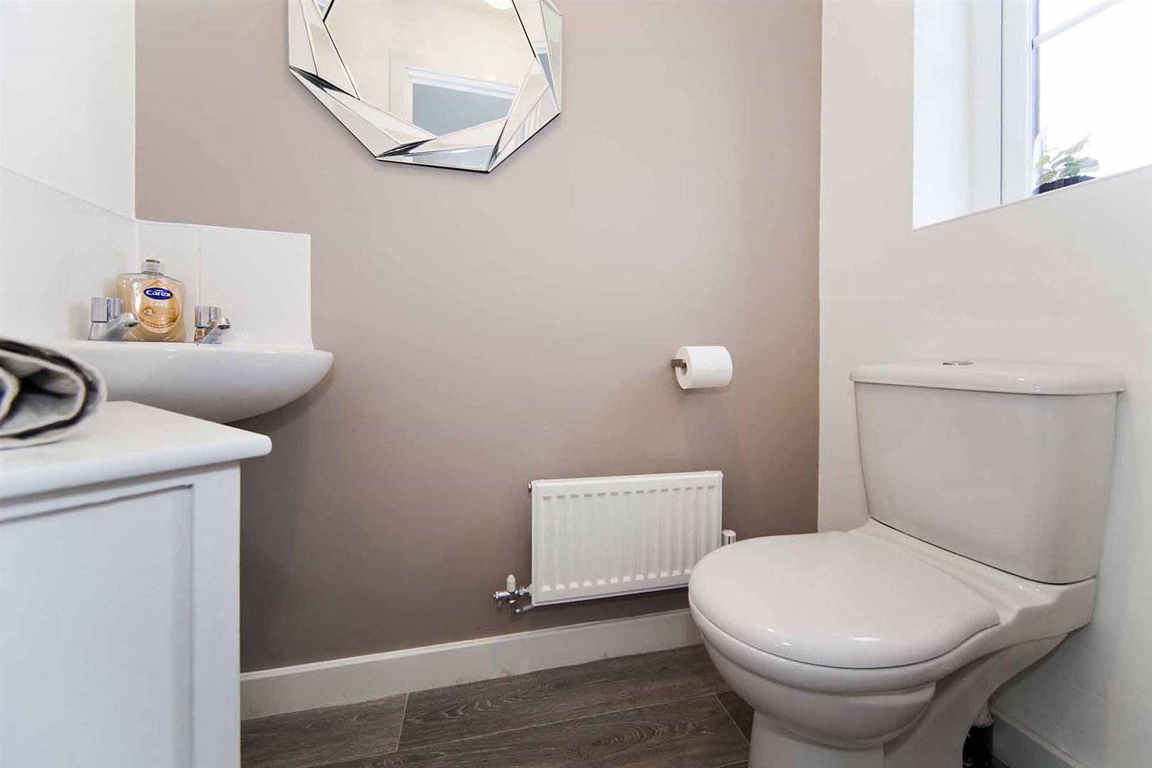 Guest cloak room which comprises close coupled WC and wash basin with complimentary tiled backsplash.