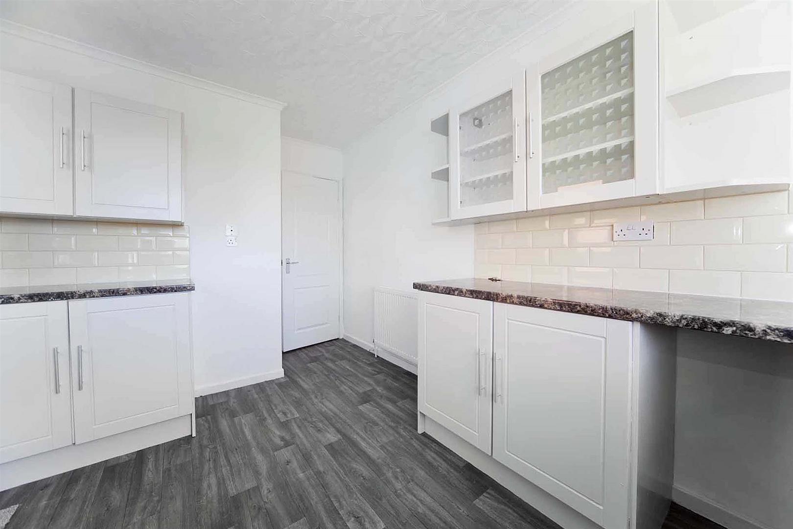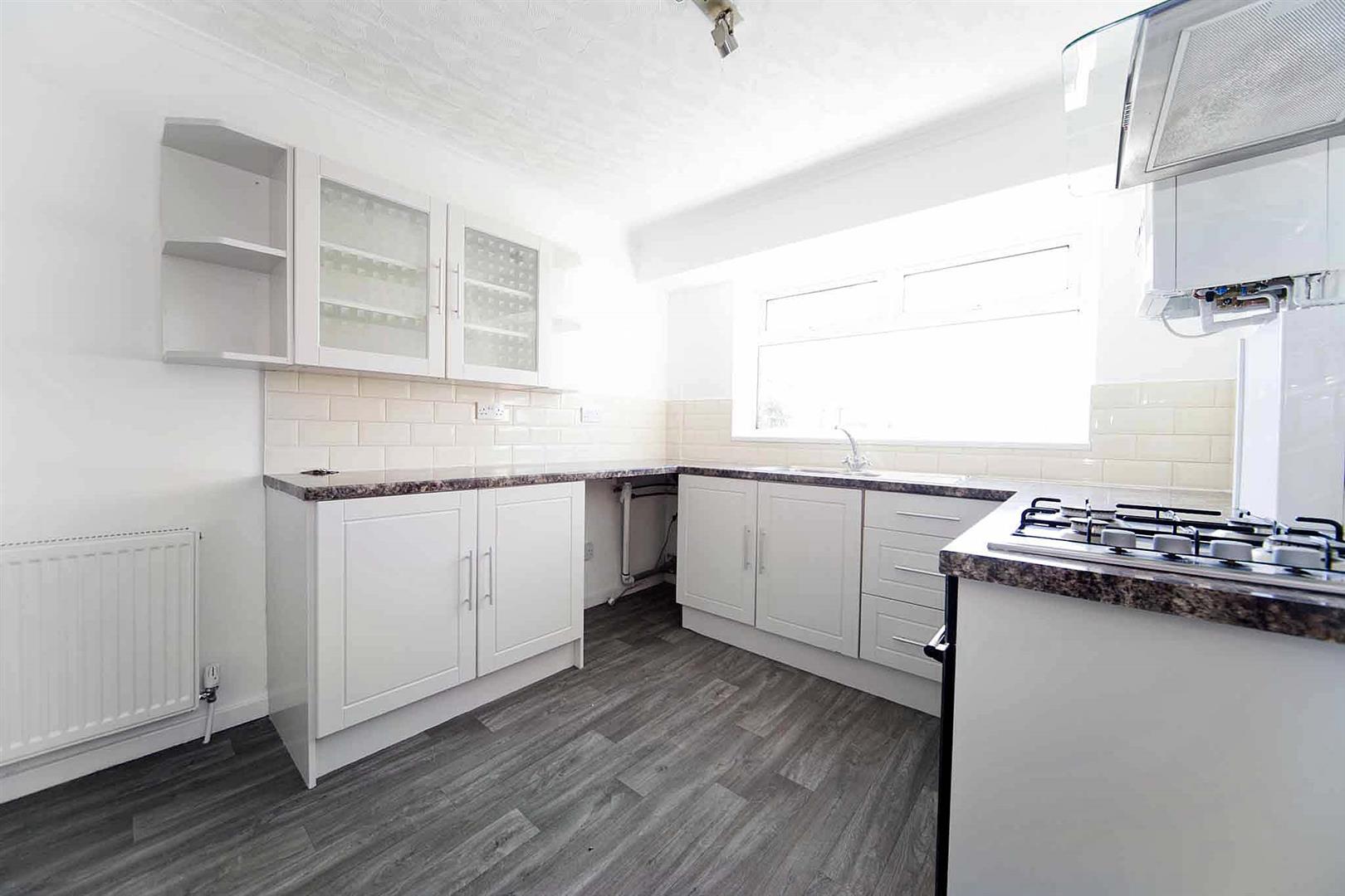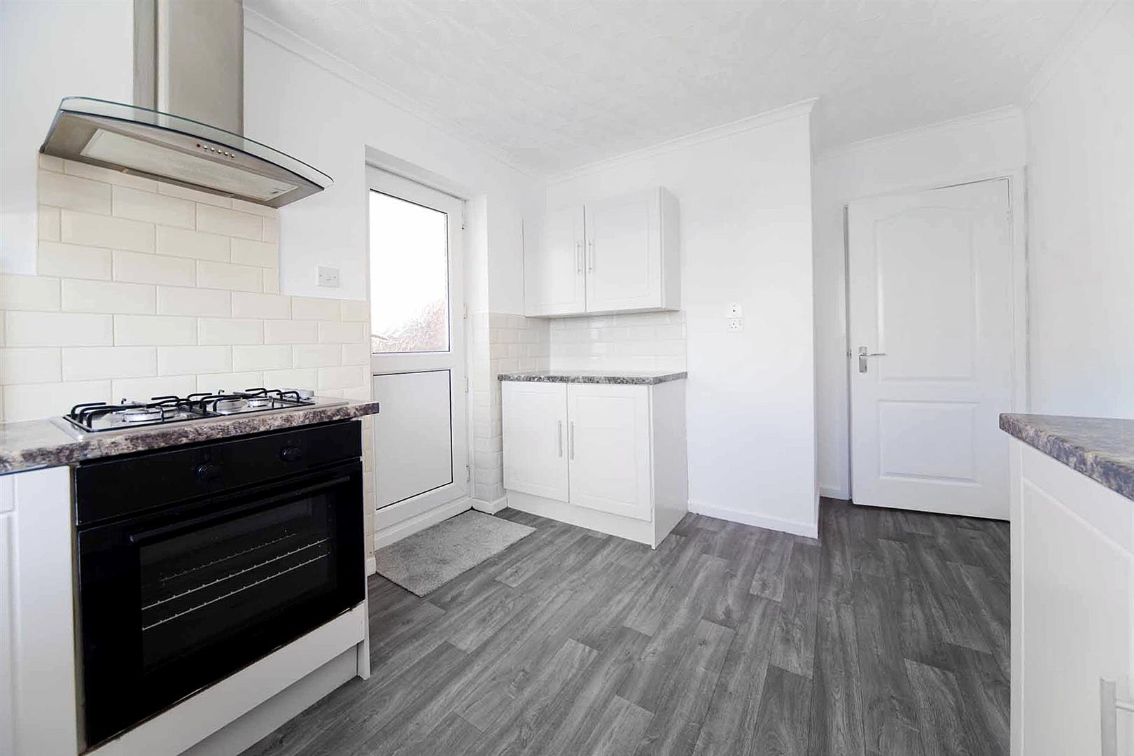The stylish kitchen comprises display, wall, base, and drawer cabinetry, complementary surfaces, subway tiled backsplash, integrated oven, integrated gas hob, integrated stainless multifunction extractor, sink with chrome mixer tap, space for fridge freezer, plumbing for washing machine, side elevation door.