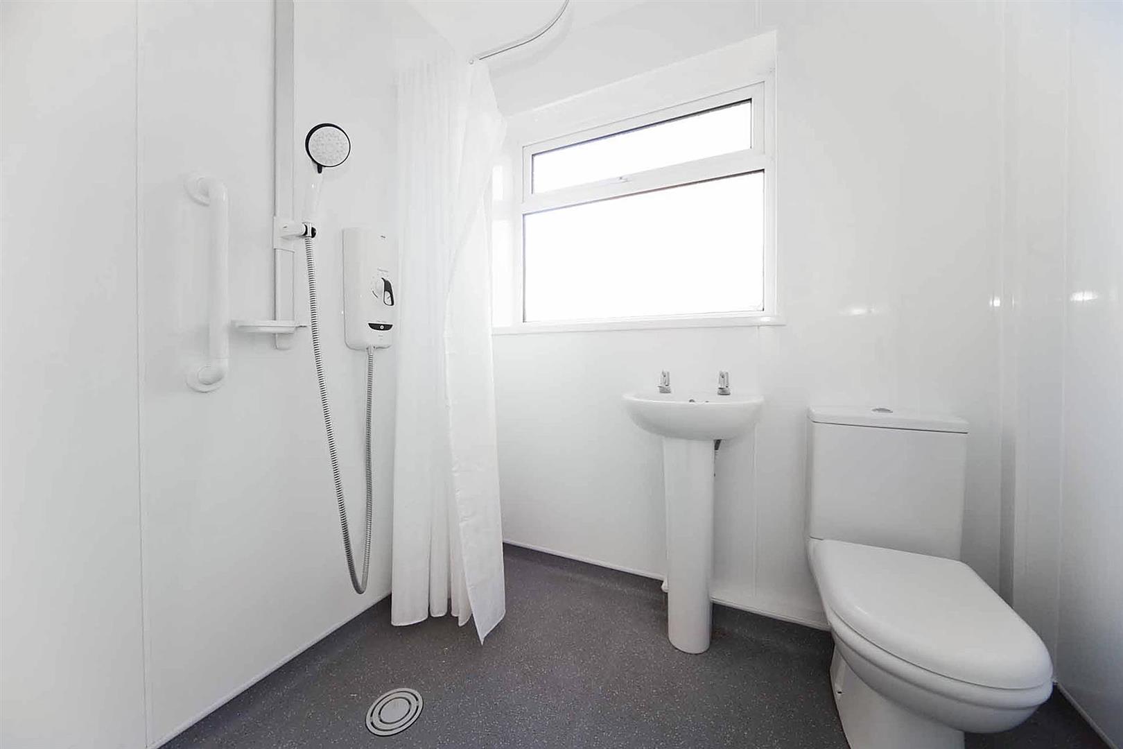 The modern shower room/wet room comprises shower, close coupled WC and pedestal wash basin, complimentary tiling, anti slip flooring.