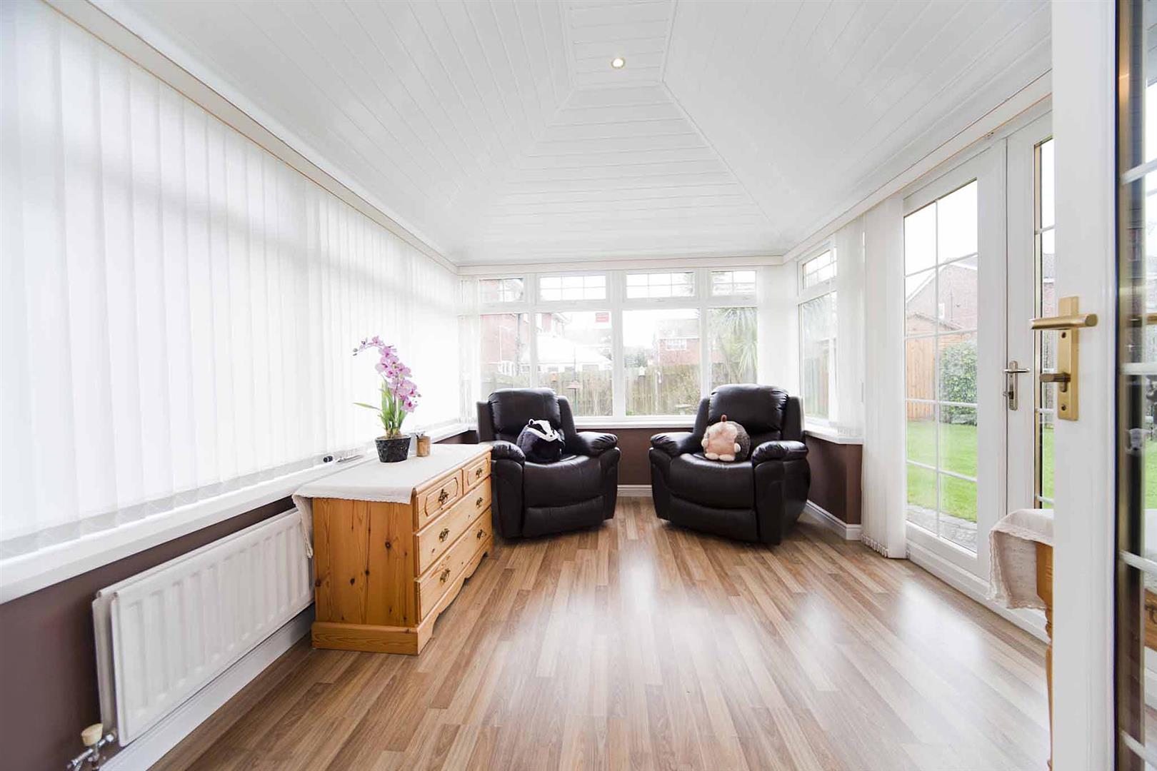 Sunny conservatory with French doors which open to the rear garden with recently fitted new solid roof, laminate flooring, recessed spotlights.