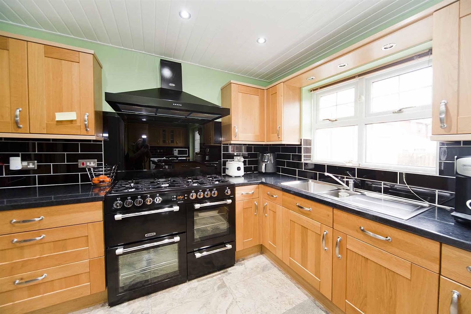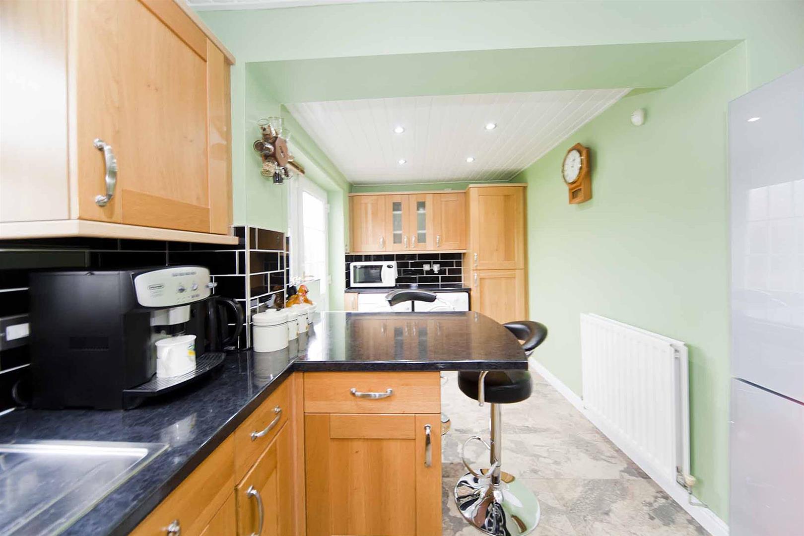 Open concept kitchen diner with dual windows and door opening to the rear garden fitted with a selection of shaker style larder, display, wall, base and drawer cabinets, complimentary surfaces, subway tiled backsplash, peninsular breakfast bar, space for American fridge freezer, space for range cooker, plumbing for washing machine, space for tumble dryer, integrated extractor hood, skinless sink with chrome mixer tap, recessed spotlights, panelled ceiling, pastel decor, tiled floor, half glazed rear access door.