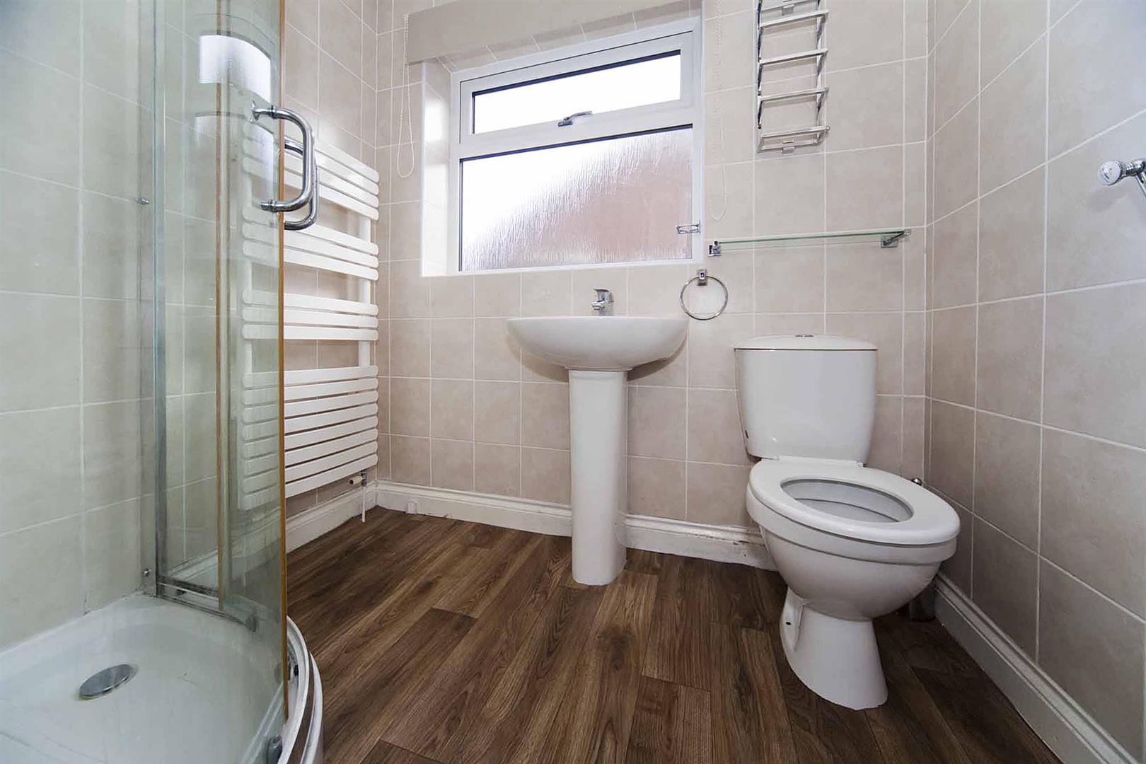 The modern shower room comprises quadrant shower enclosure, close coupled WC and pedestal wash basin, heated towel radiator, fully tiled walls.