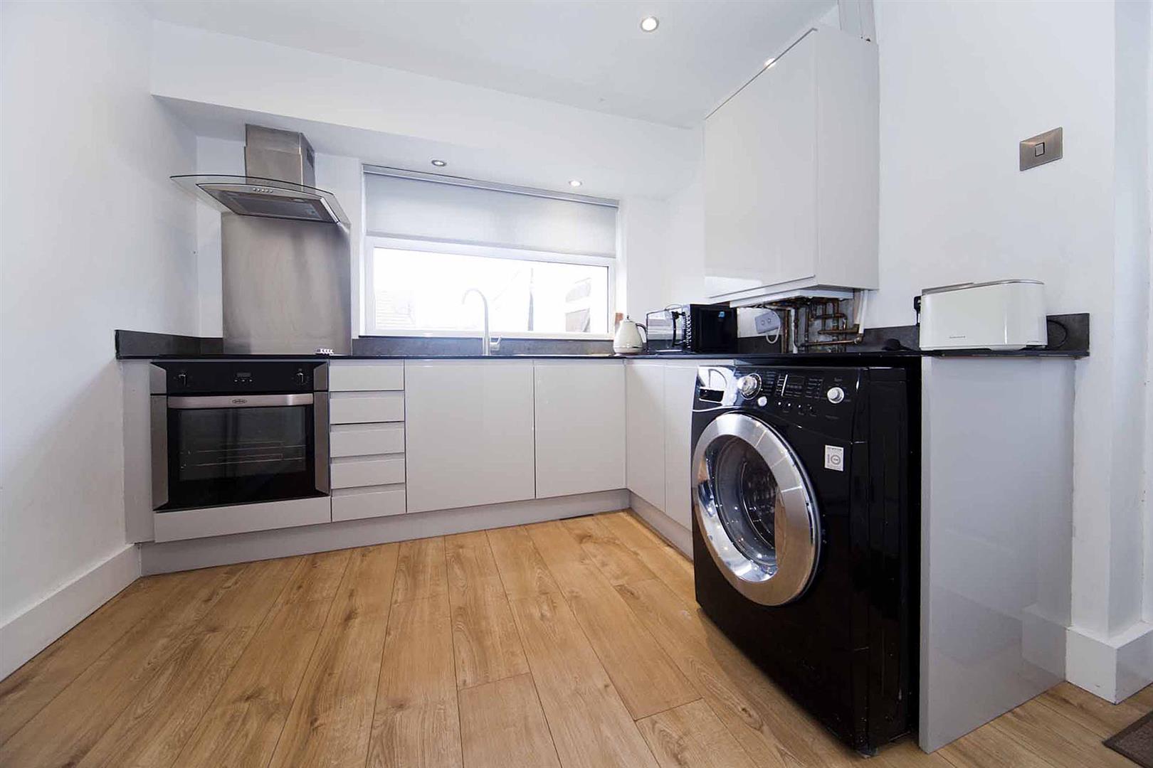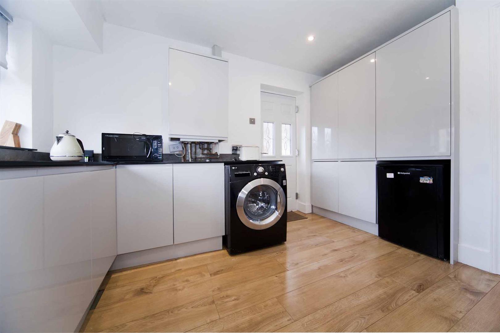 The contemporary kitchen comprises high gloss wall, larder, base and drawer cabinets in a sought after colour scheme, complimentary heat resistant surfaces, integrated oven, integrated electric ceramic hob, stainless extractor and backsplash, inset one and a half bowl sink with chrome mixer tap, plumbing for washing machine, space for fridge/ freezer, recessed spotlights, laminate flooring, half glazed exterior access door.
