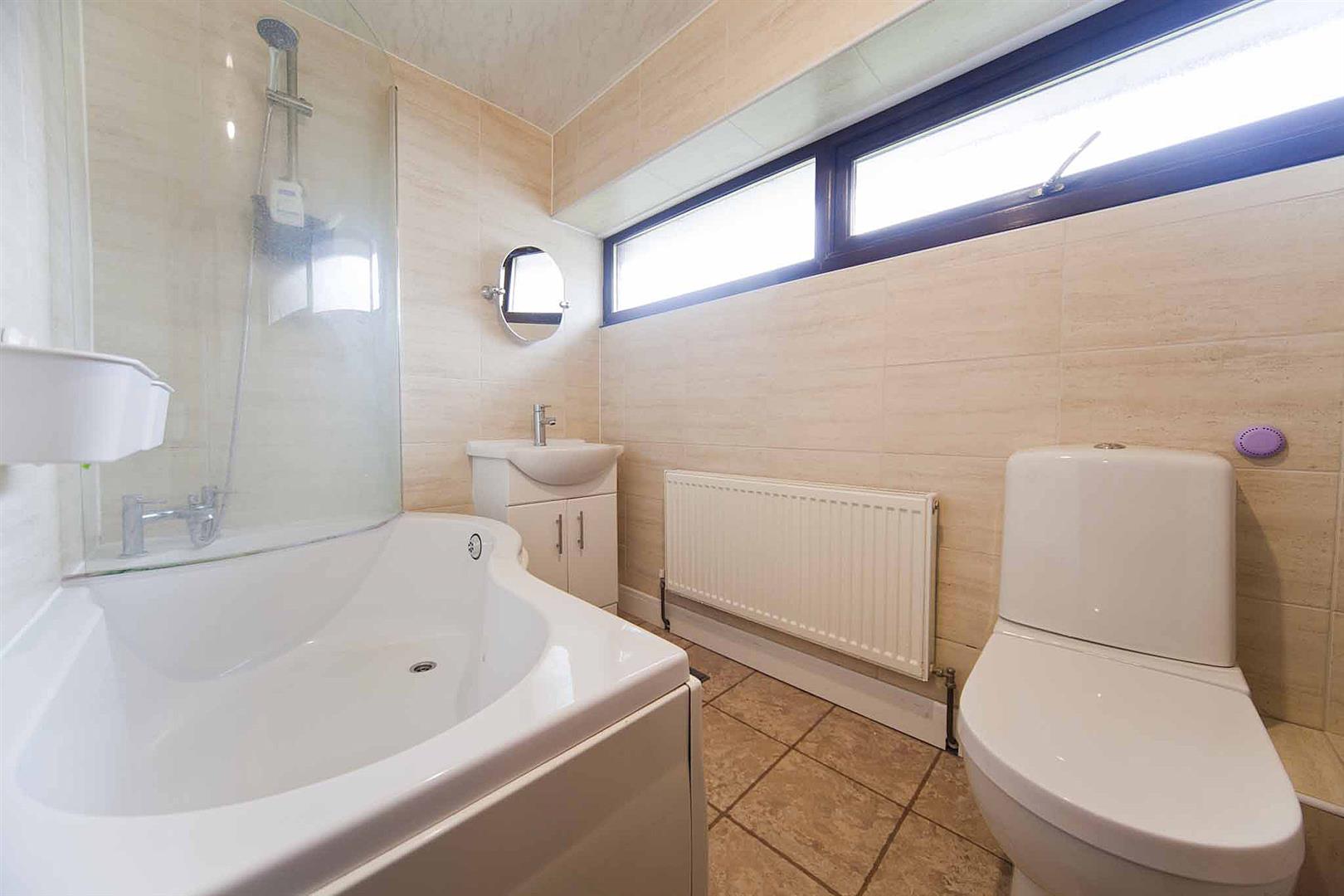 The family bathroom comprises 'P' shaped bath, over bath shower, close coupled WC, and vanity wash basin with complimentary tiling to walls and floor.