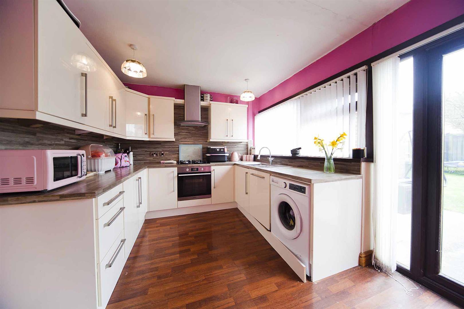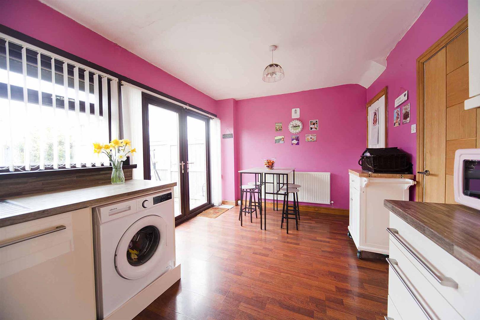 Open concept kitchen diner fitted with a selection of sleek wall, base, and drawer cabinetry, complimentary surfaces, co ordinating backsplash, integrated dishwasher, integrated oven, integrated gas hob, integrated stainless extractor hood, integrated dishwasher, plumbing for washing machine, integrated fridge freezer, one and a half bowl sink with chrome mixer tap, ample dining space, laminate flooring, French doors which lead to the rear garden, under stairs storage cupboard.