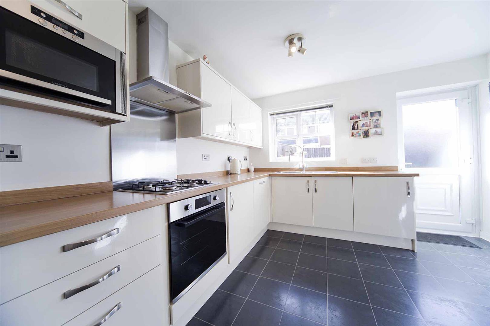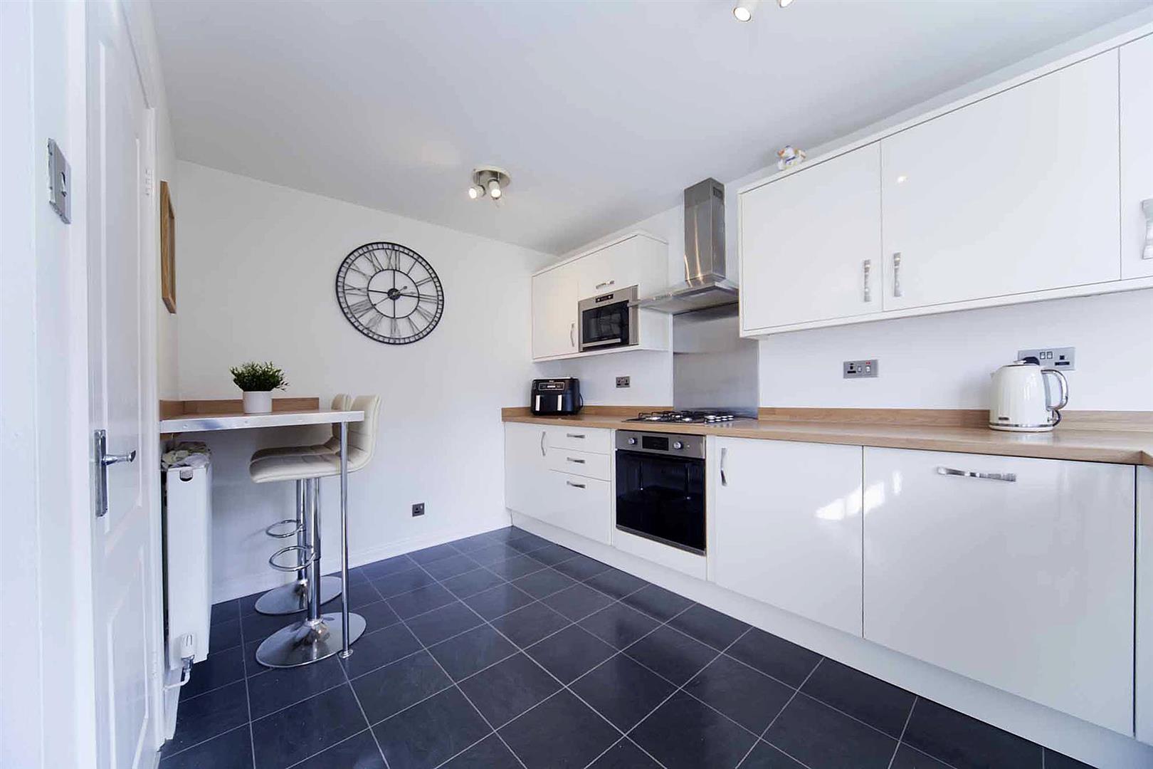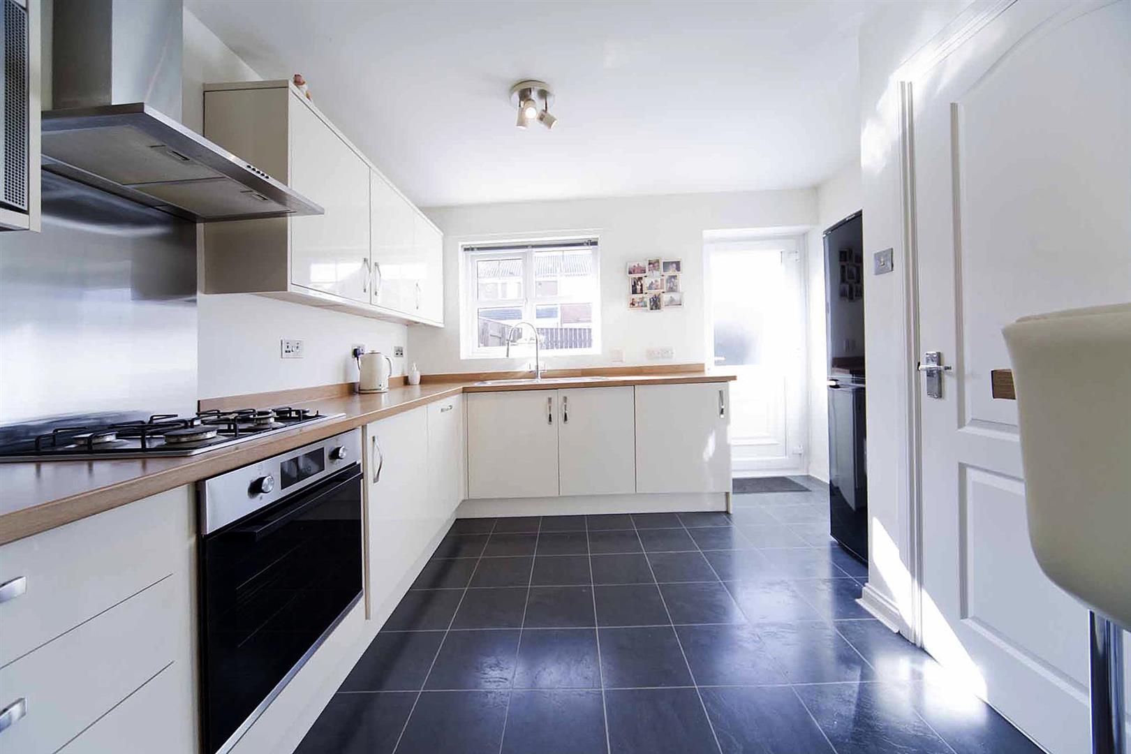 Contemporary kitchen which comprises sleek white high gloss wall, base, and drawer cabinetry, complimentary surfaces, integrated oven, integrated gas hob, integrated stainless multifunction extractor, integrated microwave, integrated dishwasher, stainless sink with American style jet swivel mixer tap, space for refrigerator/freezer, breakfast bar, glazed rear access door.