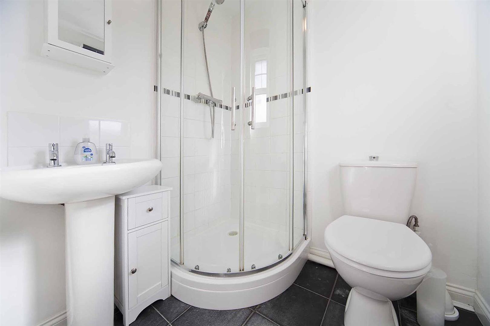 Ensuite shower room comprising quadrant shower enclosure, close coupled WC and pedestal wash basin with complimentary tiling.