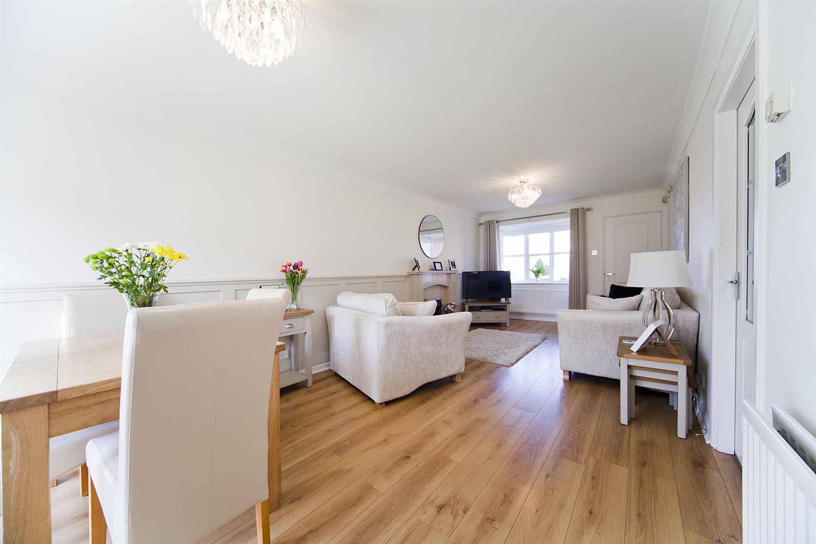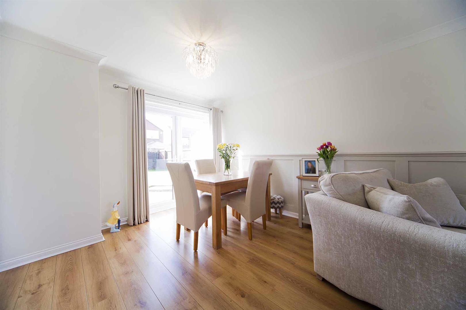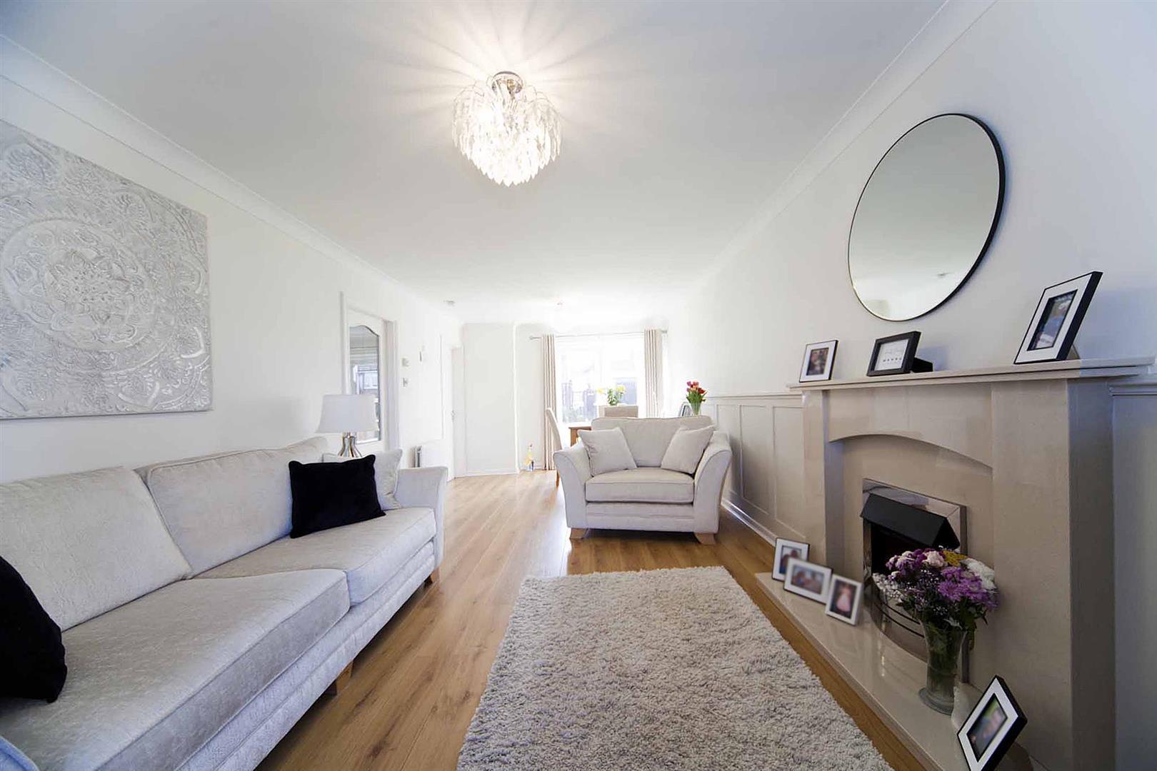 Spacious dual aspect lounge diner with window to the front elevation and with French doors opening to the rear garden, impeccable decor, decorative coving, bespoke wall panelling, feature fire surround with inset pebble effect electric fire.