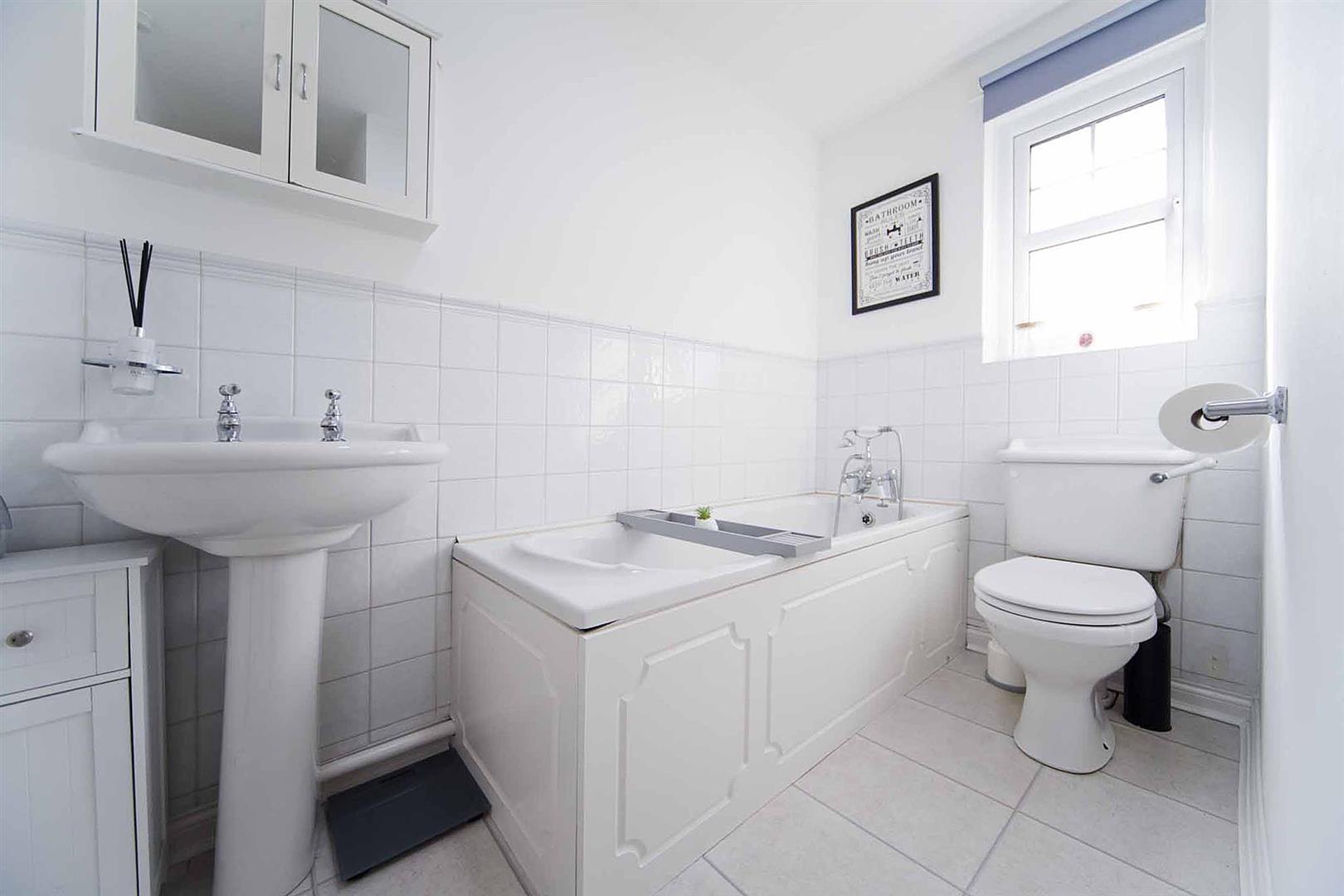 The family bathroom comprises close coupled WC, pedestal wash basin and bath with complimentary tiling, tiled floor.